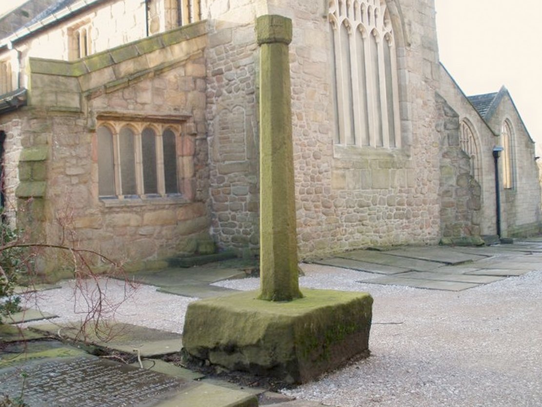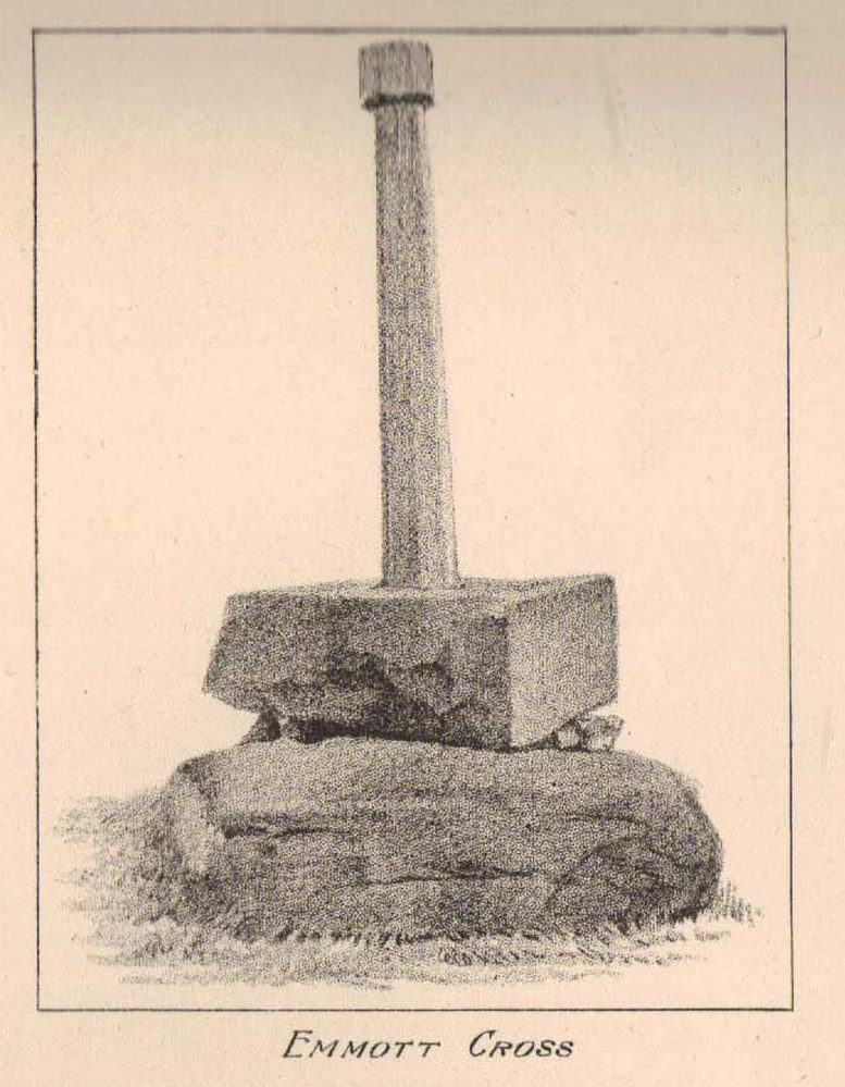 At the north side of St Bartholomew’s church-yard, Colne, stands the medieval Emmott Cross or Touch Cross. It was re-erected here in 1967 by local historian Mr Wilfred Spencer and a team of volunteers having being removed from the grounds of Emmott Hall, Laneshawbridge, when the old hall was being pulled down. The cross had stood for centuries close to the famous Hallown Well, both of which were highly venerated by pilgrims travelling between Whalley Abbey and Yorkshire. It appears that originally the cross had stood at the side of the Stanbury to Haworth road over Herders, close by Emmott.