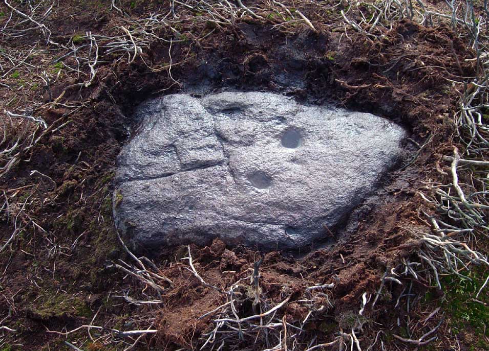“Fairly small flat rock, level with the ground, sloping slightly in heather and crowberry, its surface layered in waves which appear to have been incorporated in the design which covers the rock. About 25 cups, some very deep and some showing pick marks, three are enclosed in rings, one of which has three cups in its circumference and a groove leading from it to edge of rock.”