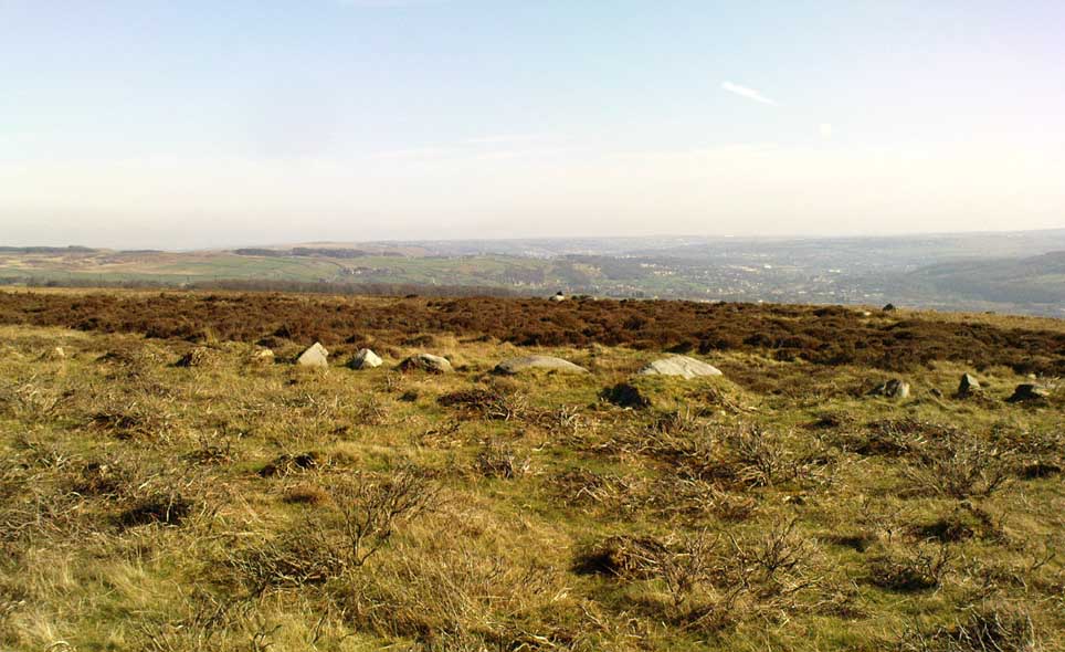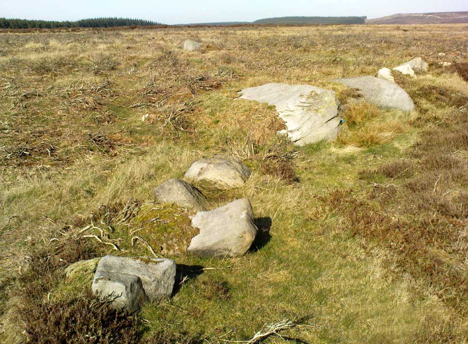 “At the south end of the main rock surface there is the lightly-pecked outline of a shod right foot. 0.24m long and 0.1m in maximum width, with a pronounced taper to the heel. There are further peck marks within the outline, and a sunken footmark was intended but not completed. This print is on almost the same alignment as the more prominent footprint some 2m to the north, which measures 0.27m from NNE to SSW, by 0.1m in maximum width and 25mm in depth. It is somewhat broader at the heel than the incomplete mark, and its sides are straighter.”