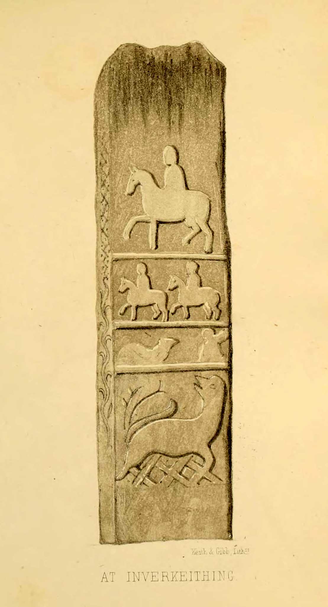 “It has been supposed by some that “St. Margaret’s Stone,” a block now lying on the side of the highway leading from Inverkeithing to Dunfermline, and about midway between these places, can be identified with the standing stone referred to in the Statistical Account. Mr Skene has noted below a sketch of St. Margaret’s Stone:- “The sculpture upon this stone has been lately chipped off in mere wantonness, so as to leave few traces of the subject recorded upon it.” He farther states that it formerly stood erect, and was called “The Standing Stone.” According to Mr. Skene’s measurement, St. Margaret’s stone is about nine feet and a half in length, one foot in thickness, and four feet broad at the widest end, and broken off to a narrow point at the other.”
