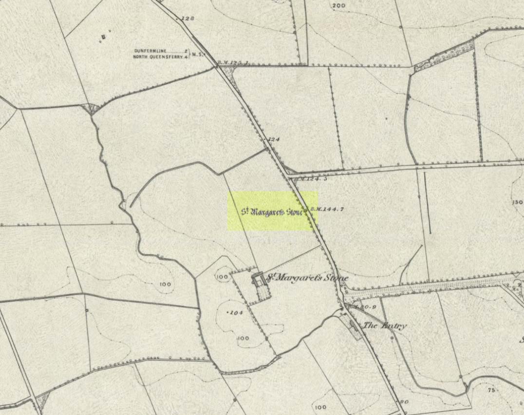 When the Saxon Queen Margaret landed on the shores just west of Queensferry at Rosyth Castle (NT 1087 8200), legend reputes that she and her entourage made Her way north towards Dunfermline. Halfway along the ancient track She rested at this large stone which, thereafter, gained the name by which we know it today. It was said that Queen Margaret subsequently visited the stone on a regular basis for periods of solitude. The tale probably has some germ of true in it. Additional ingredients also told that,