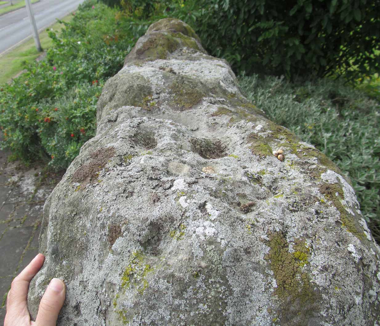 “This stone…stands with its main axis due north and south and measures 8 feet 6 inches, by 4 feet 7 inches, by 1 foot 6 inches. On one side the entire surface is cup-marked, the markings varying in size from 1¼ inches to 3¼ inches and having an average depth of from ½ to ¾ inch.”