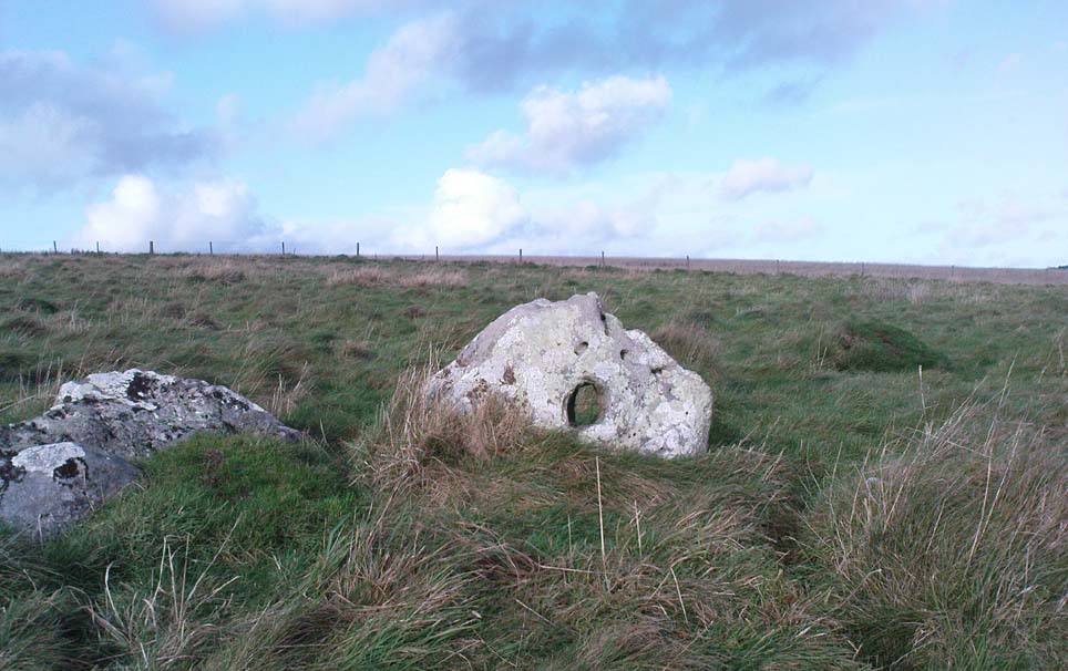 As I’ve only been here once, and briefly — under the guidance of the Avebury expert Pete Glastonbury — my bearings on this site may need revising. There are two distinct sections of walling here: one has been excavated by Peter Fowler and his team; the other hasn’t. (correct me if I’m wrong Pete) And in Fowler’s (2000) fine survey of this area he does not describe this very distinct holed-stone in the line of walling, or adjacent “linear ditch F4”, as it was called. But then, many archaeologists don’t tend to find items such as these of any interest (unless their education stretches to other arenas, which isn’t usually the case). But the stone seems to be in a section of walling that isn’t in their survey; standing out in aerial imagery as a less well-defined, but still obvious line of walling that is closer to the fence, 70-80 yards north, with a decidedly Iron-Age look about it!