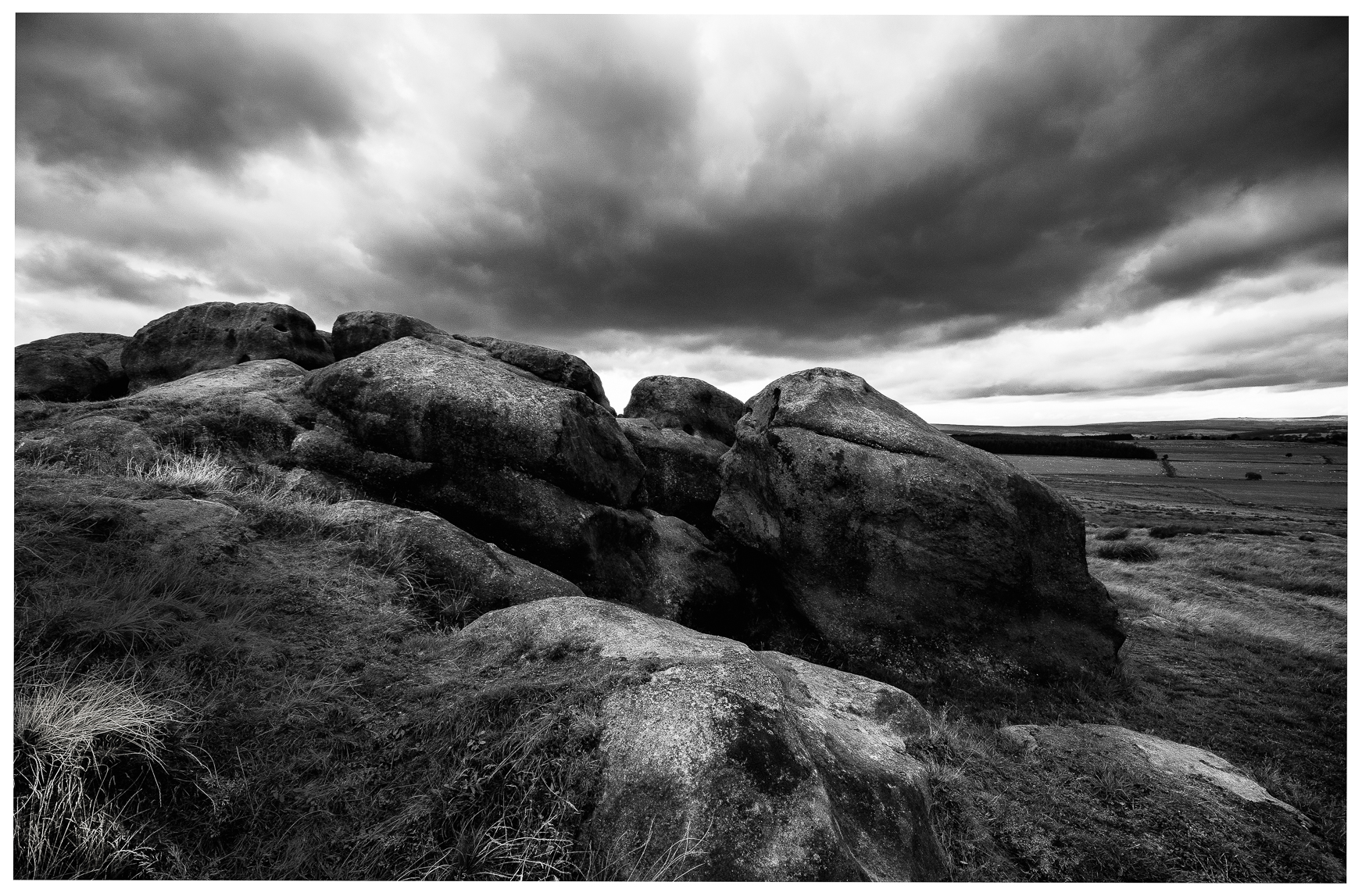 This is an outstanding site visible for miles around in just about every direction – so getting here is easy! If you’re coming from Harrogate, south down the A658, turn right and go thru North Rigton. Ask a local. If you’re coming north up the A658 from the Leeds or Bradford area, do exactly the same! (either way, you’ll see the crags rising up from some distance away) As you walk to the main crags, instead of going to the huge central mass, you need to follow the line of walling down (south) to the extended cluster of much lower sloping rocks. Look around and you’ll find it!