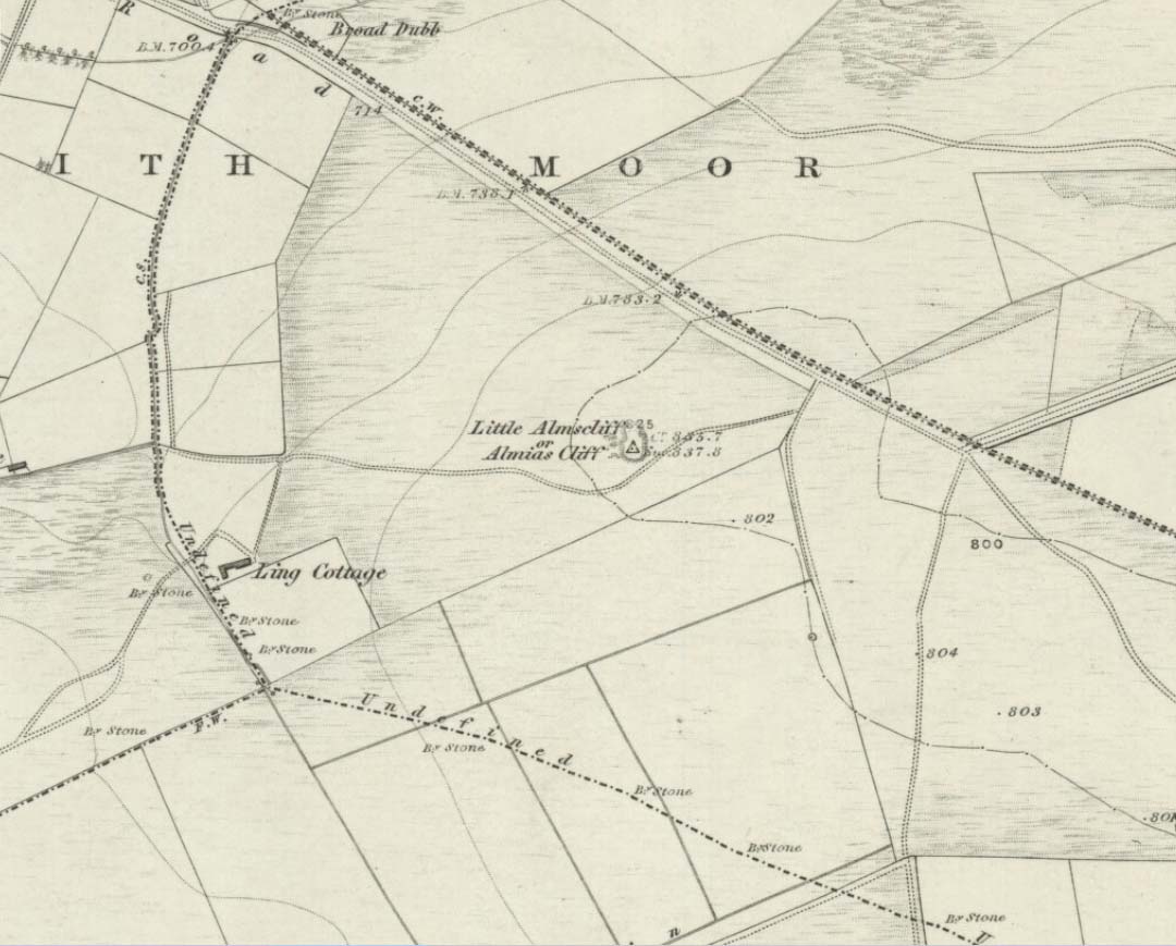 In 1702 when the northern antiquarian Ralph Thoresby mentioned this and its big brother to the southeast, he described the “two famous crags of Almes Cliff—in some old writings called Aylmoys ut dicitur—but have seen nothing memorial of it, saving its remarkable lofty situation.” He missed the cup-and-ring carving on the east-side of the crags, obviously, which indicates that it had some form of animistic sanctity in ancient times.