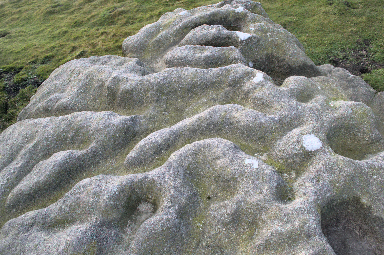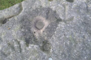 This impressive-looking rock that sits between the two buildings has a number of cup-markings of varying sizes across its topmost surface: some deep and some not-so-deep. There are perhaps as many as 20 of them on different parts of the stone, but some have been intruded on by more recent graffiti. On a recent visit to the site, photographer James Elkington and his young assistant MacKenzie, saw what looked like “a very faint ring around one of the cups” – which doesn’t surprise me. On one section of the stone we see a fascinating series of natural curves and geological undulations, some of which may have been modified a long time ago when the cupmarks were etched. But whether they were added to or not, it’s more than likely they’d have had some significance in the mythic nature of the rock.