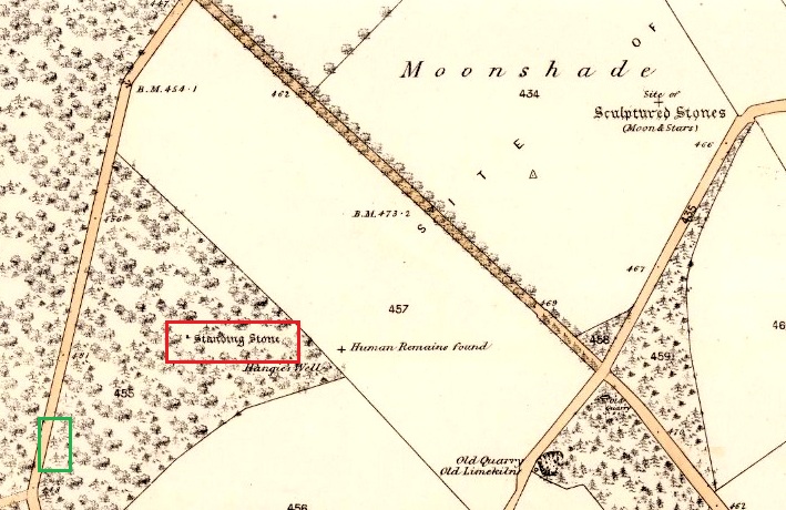 25 in OS map of 1866 showing original position of stone outlined red and position of possible remains of stone in green