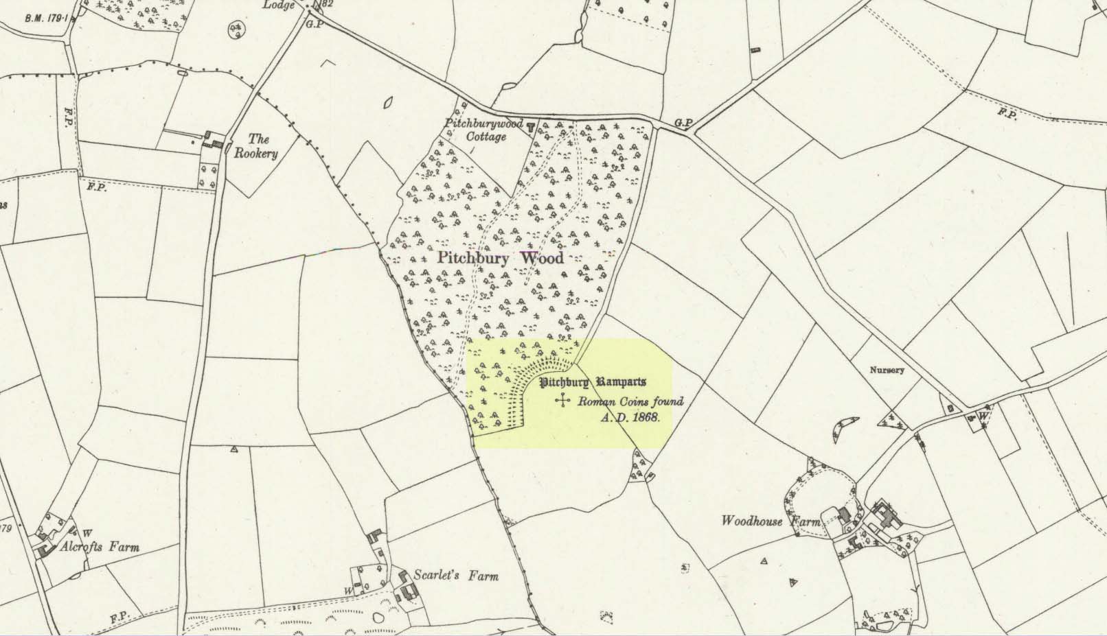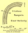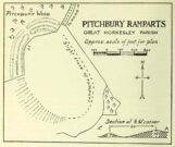 “are some remains of an earthwork known as ‘Pitchbury’ or ‘Pitsbury Ramparts.’ When the late Rev. Henry Jenkins described the camp in 1841, he stated that it was of oval shape, and contained about 6 acres. Most of it was levelled for agricultural operations about fifty years ago, but there are still some remains, consisting of two banks with their accompanying ditches. The lines moreover of that part which was destroyed, can be partially traced in the adjoining fields.”