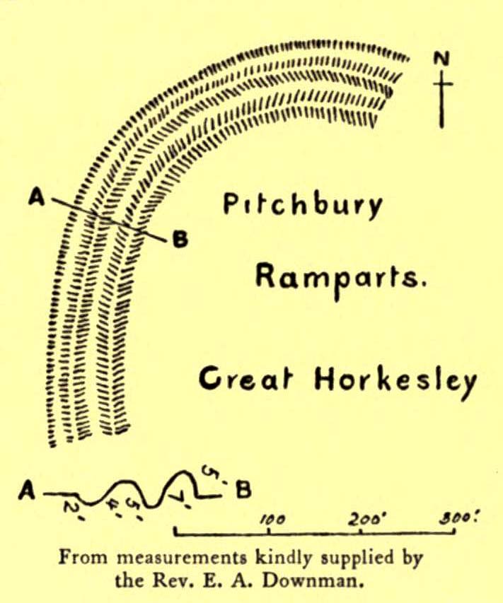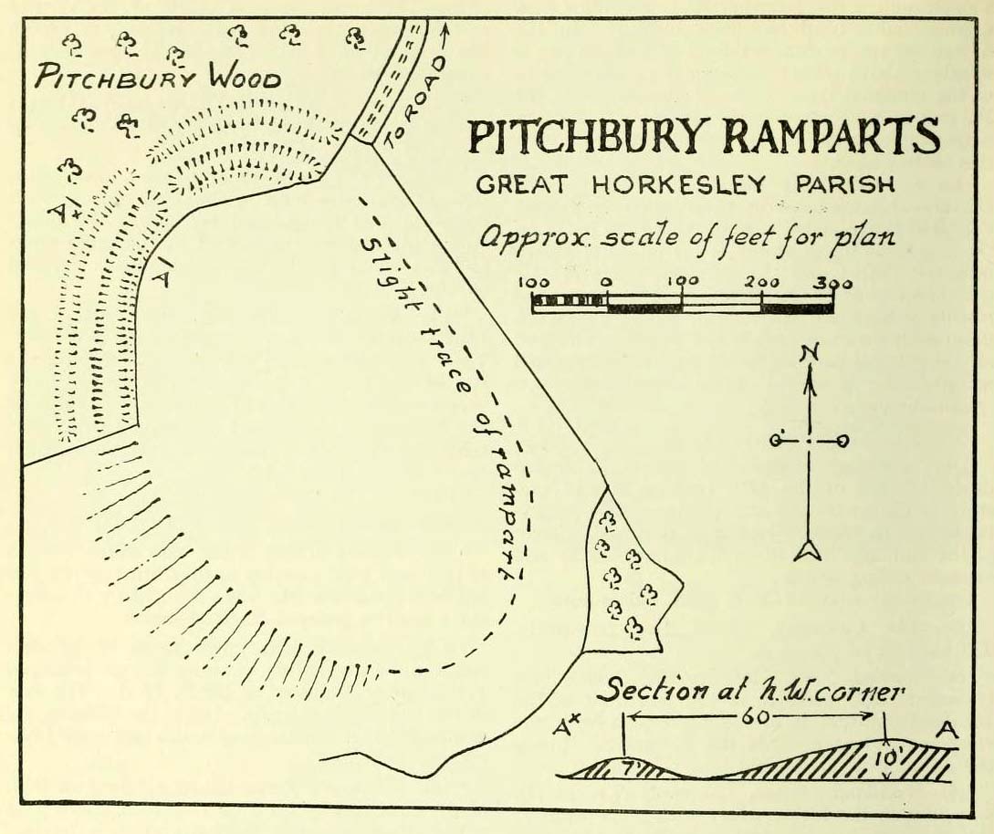 “Pitchbury Ramparts, in Pitchbury Wood, about 2 mile south of the church, are the north end of a large camp, roughly oval in shape, and defended by a double rampart and ditch. The defences are well preserved in the wood, the inner rampart being 10 ft. above the ditch, which is 60ft wide from crest to crest, but the greater part of the work has been almost obliterated by the plough, and is now only faintly discernible in a large field S. of the wood. The camp appears to have been 800 ft. long and 600 ft. wide.”