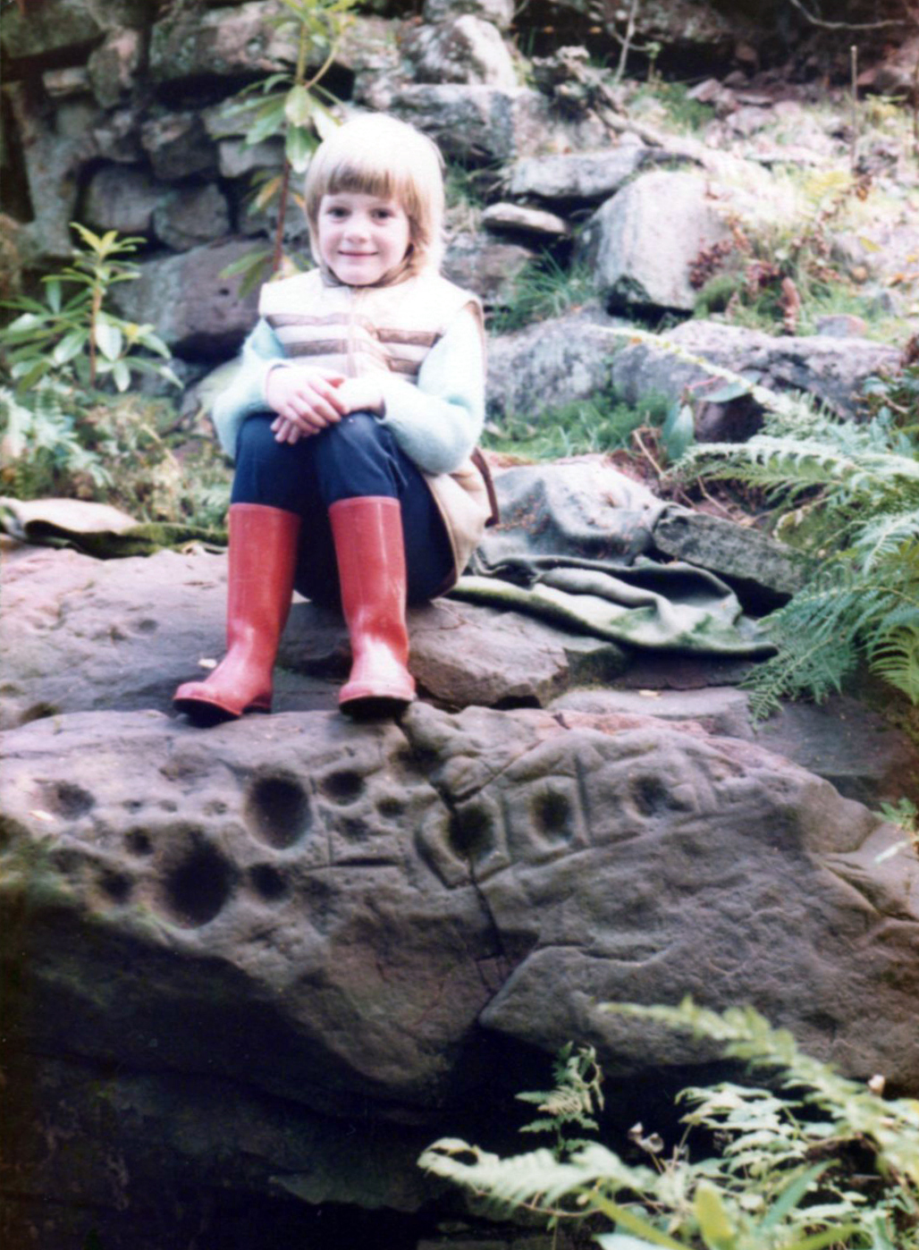 We’re not quite sure who first rediscovered the carving. In an early photo of the site taken in the late ’70s or early ’80s, a young Allison McLaren sits highlighting the design. But she wasn’t the fortunate lass who discovered it! One account describes a local woman, Lady Younger of Leckie House, who was out walking her dog, accidentally dislodging some of the rocky debris of the Iron Age broch and unearthing the petroglyphs, thereafter taking Allison along to see it. The other account tells of it being noticed for the first time during an excavation of the broch by Euan MacKie and his team. Whichever it was, Prof Mackie (1970) was certainly the first person to write about it. He told: