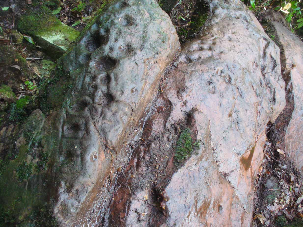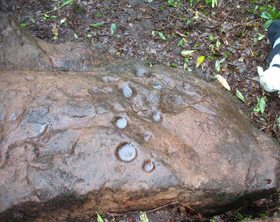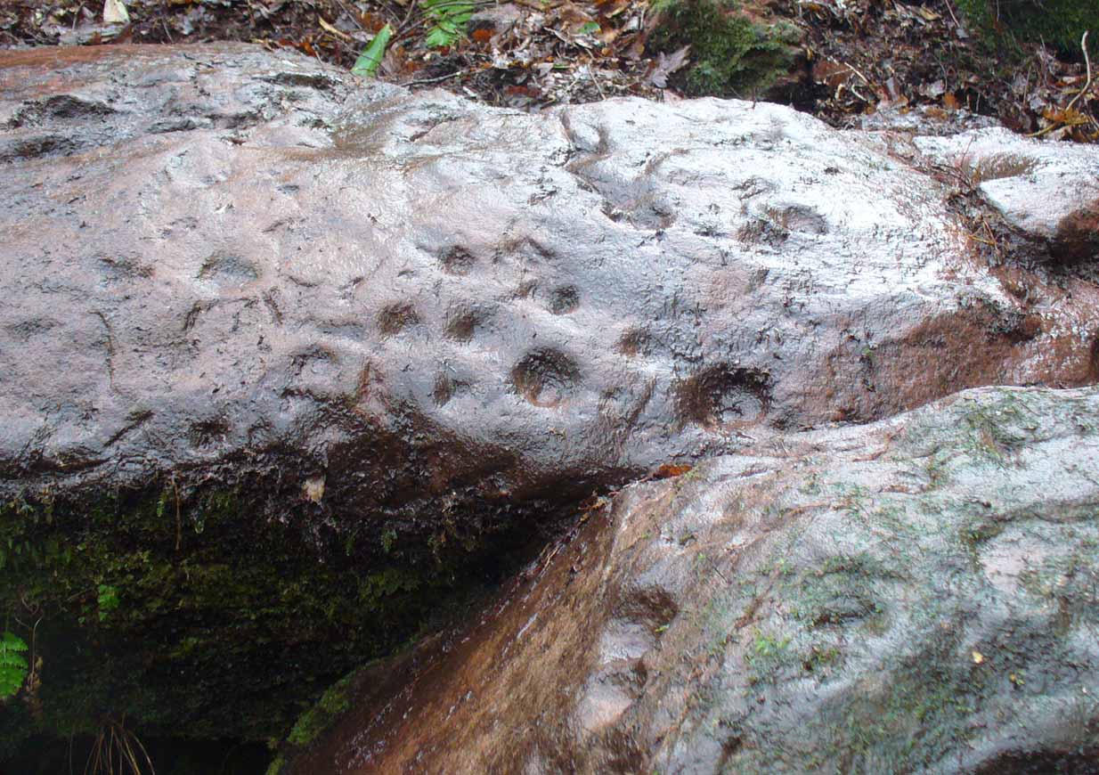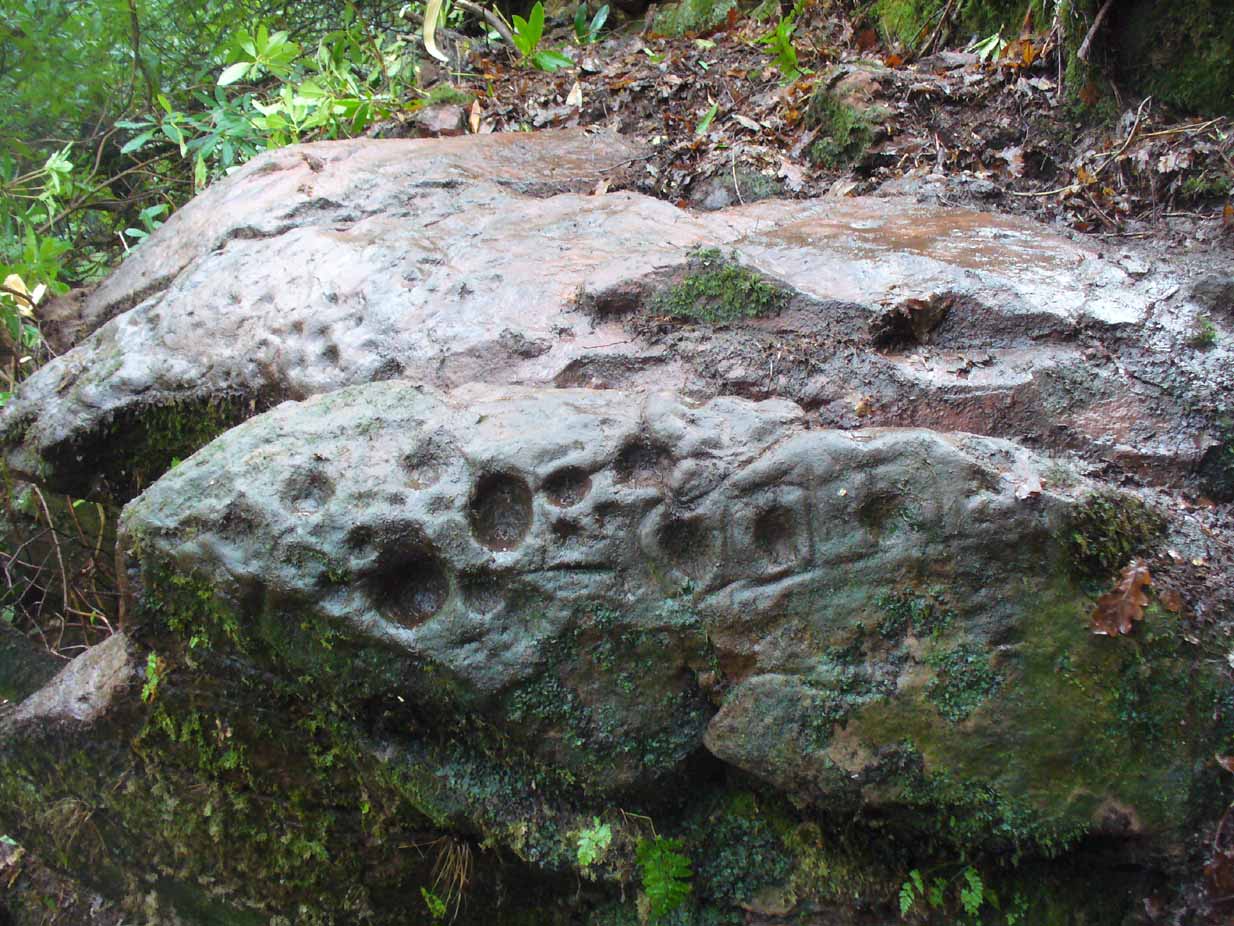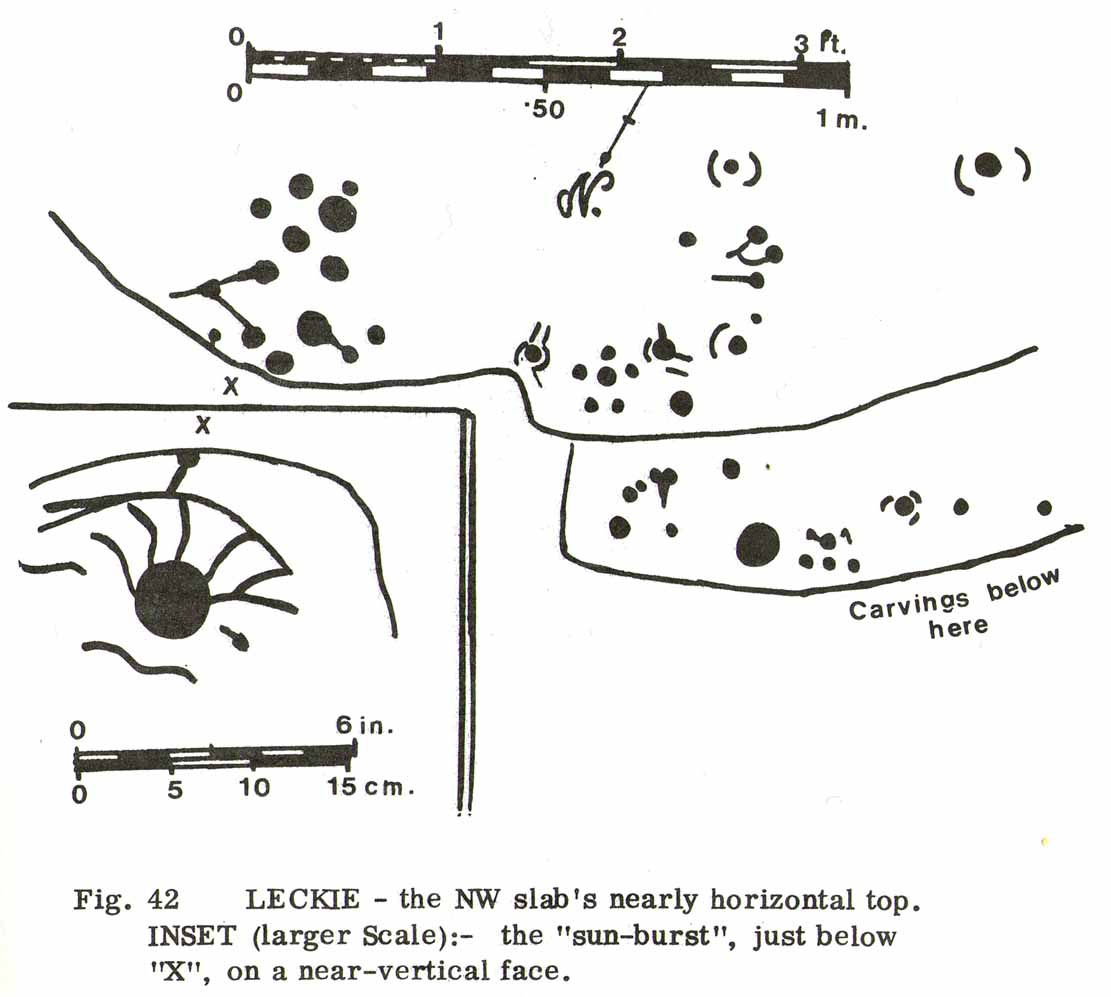 “carved over about 3m (yds) at heights of 1-2m (yds) on faces now sloping mostly 0-90º NW, with 3 cups-and-one-near-hexagonal-ring up to 12cm (4½in) diameter, a ‘sun-burst’ and other grooves, and at least 40 cups up to 12cm (4½in) diameter and up to 8cm (3in) deep. On a vertical E-facing slab there are also many grooves, some of which connect lines of cups. Some grooves resemble a ‘sea-horse’, an ‘axe’, etc. All except the cups are probably incised, but some may be natural.”