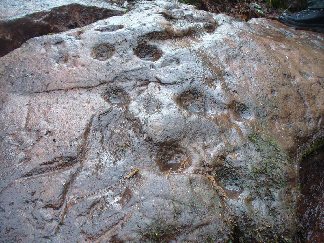 Above the top of this vertical carved face is a gap between this and a second, larger earthfast stone. This has a series of cups, some with faint rings around them, but most of them are just cups, both shallow and deep, running down the slope of the rock. A notable ‘star’ of five cups surrounding a single-cup stands out on this section. Some of them seem to have been geophysical in nature, but again have been touched-up and added to.