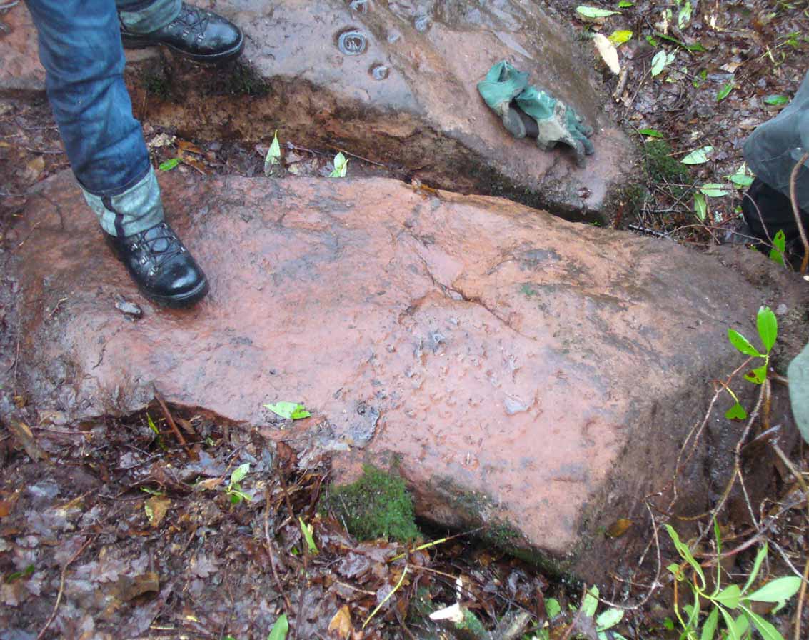 Slightly higher still, on another third section of rock, a curious cluster of weird ‘pecks’, almost in a square pattern, with a possible cup-mark close to the edge of the stone is clearly visible. The edge of this rock seems to have been quarried and the markings here may just be mason marks preceding the breaking of the stone in the Iron Age.