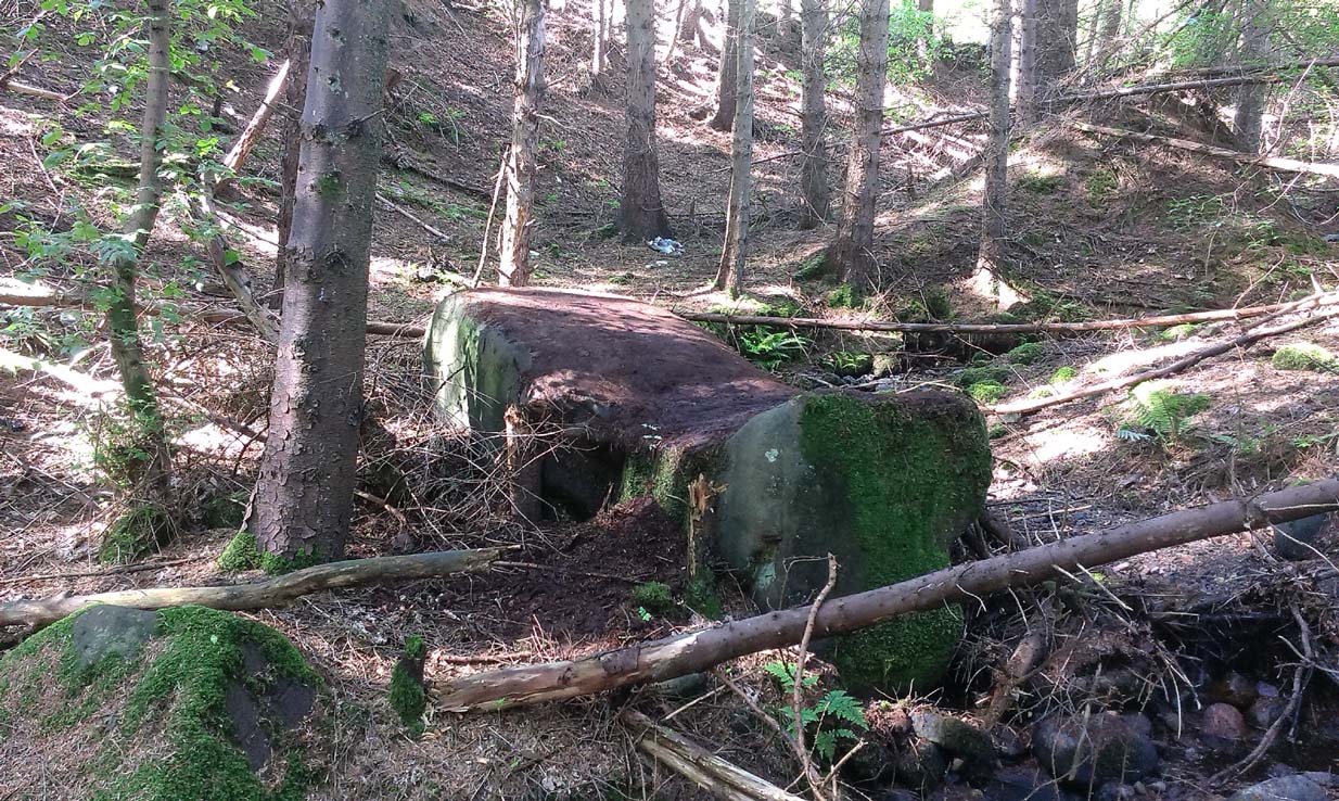 “was supposed to cover hidden treasure, and various attempts were made at different times to remove it, sometimes with six or even eight horses. At one of these attempts, his Satanic Majesty, having been invoked by the local title of ‘Old Lad’ appeared, it is said, in person, where upon the stone fell back, upsetting the horses. On another occasion a black mouse, probably the same Being incarnate in another form…ran over the gearing of the horses, with a similar result. Eventually, as a last resort, to break the spell, the boulder was buried, and now no trace of the boulder, black mouse, or Satan’s foot-print remains.”