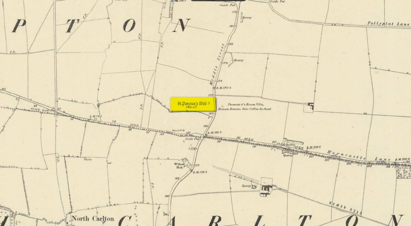 “The circumstance…of the chalybeate spring within a few yards from the entrance of the villa, and still called Saint Pancras Well…favours the conclusion of a chapel having been erected on its site. (This) is supported by the strong evidence of a discovery, upon record, that a chapel dedicated to Saint Pancras did actually exist on this spot, so early as the beginning of the twelfth century; about which period Richard Fitz-Robert of Scampton gave to the monastery of Kirksted three selions of land in that lordship, two of which are described in the gift as lying in the south field, on the south side of the chapel of Saint Pancras.”