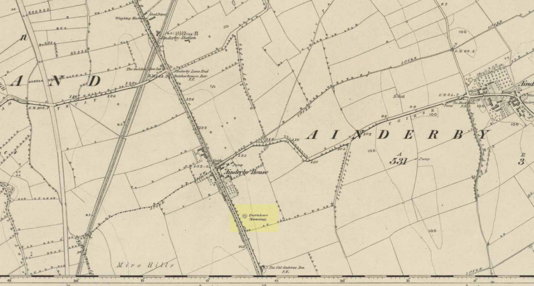 Long since destroyed by the self-righteous advance of the Industrialists, this was a pretty impressive-looking tomb according to the account of D.M. Waterman (1951). Found between the villages of Ainderby Quernhow and Kirklington, right at the side of an important prehistoric trackway—later used by the Romans and known as Leeming Street (on what is now the A1 motorway). Waterman cited it as being “of primary importance in prehistoric times” as it stood on the great plain between the three great henges of Thornborough to the north and those on Hutton Moor to the south, accompanied by a number of other tumuli nearby.