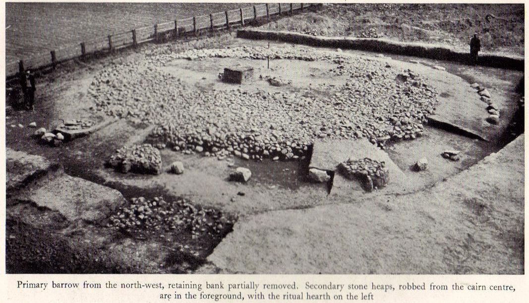“The material of the cairn was composed of cobbles or boulders, all of local geological origin, ranging in size from a few inches up to a foot in diameter or more. A stone considerably larger in size was occasionally encountered , the largest found measuring 23in by 20in and from 3in to 5in in thickness. The stones were heaped up without any deliberate attempt at producing a stable structure and used indiscriminately, irrespective of size or shape, although there was a tendency for the larger stones to occur towards the perimeter of the cairn. Since the cairn itself was built to a flat surface, and the underlying barrow-mound assumed a saucer-shaped profile, the cobbles perforce increased in depth towards the cairn face; at the very centre they were laid one, occasionally two deep, at the face three or four deep, although irregular size and placing precluded any consistency whatsoever in the work. The standard of the building in fact differed considerably throughout the structure. On the northeast and northwest the facing-stones were quite carefully laid, standing to a height of 22in, the work becoming increasingly shoddy towards the south where the construction had so deteriorated that whole sections of the facing had fallen bodily away from the cairn mass, slipping down the tail of the underlying mound…”