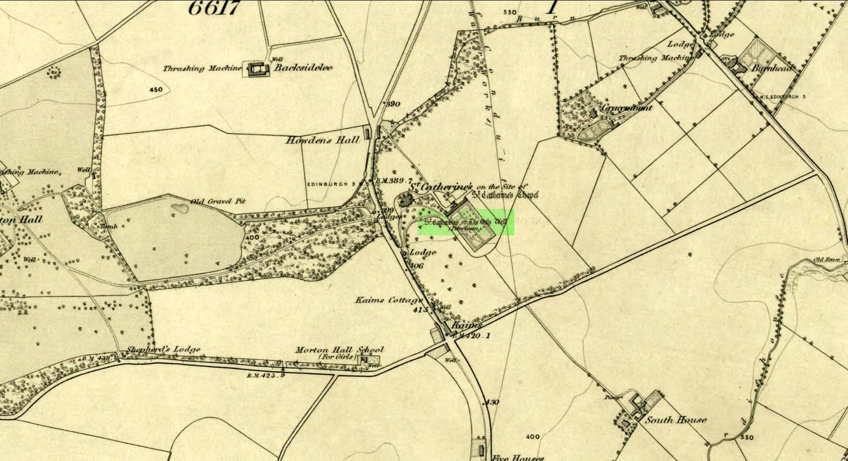 “belonged to a very ancient chapel dedicated to St. Catherine, which stood with its burying-ground near the modern mansion of St. Catherine’s. All trace of this chapel has disappeared, but at the end of last century its ruins were still extant. It was reputed to be the most ancient place of worship in the parish, and the ground around the chapel was consecrated for burials. Hither came annually in solemn procession the nuns from the Convent of Sciennes, a foundation due to the piety of one of the St. Clairs of Rosslyn, who may possibly have also been connected with the origin of the Chapel of St. Catherine.”