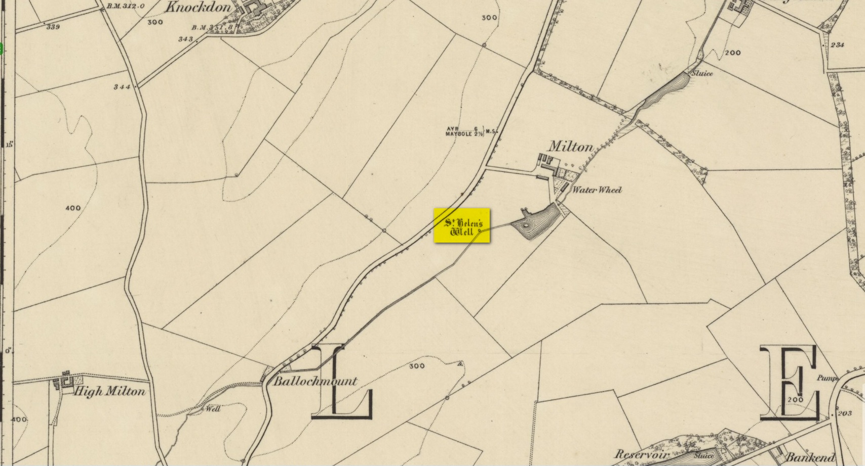In spite of this site being covered over some time in the 1950s, it is still retained on the modern Ordnance Survey maps. It was shown on the first one in 1860, but its literary history goes back much further. We find it described by the Minister for Maybole — one William Abercrummie — in his short 17th Century work named A Description of Carrict. He noted several springs in Maybole township, with this one of possessing the usual hallmarks of both christian and peasant customs alike: