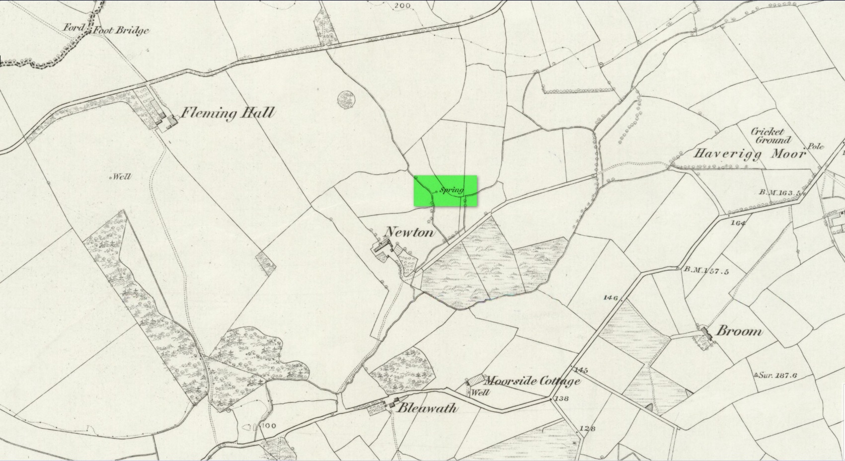 Parker found it to have been described in a local property charter in St Bee’s Register (Wilson 1915) as far back as 1220 CE. On the earliest OS-map of the area, a “Spring” is shown just above Newton, which may mark the very spot! Not far from the holy well was also a cross-marked stone called the Grey Stone (grey stones are usually boundary stones, but can also be standing stones—of which there were a lot in this neck o’ the woods).
