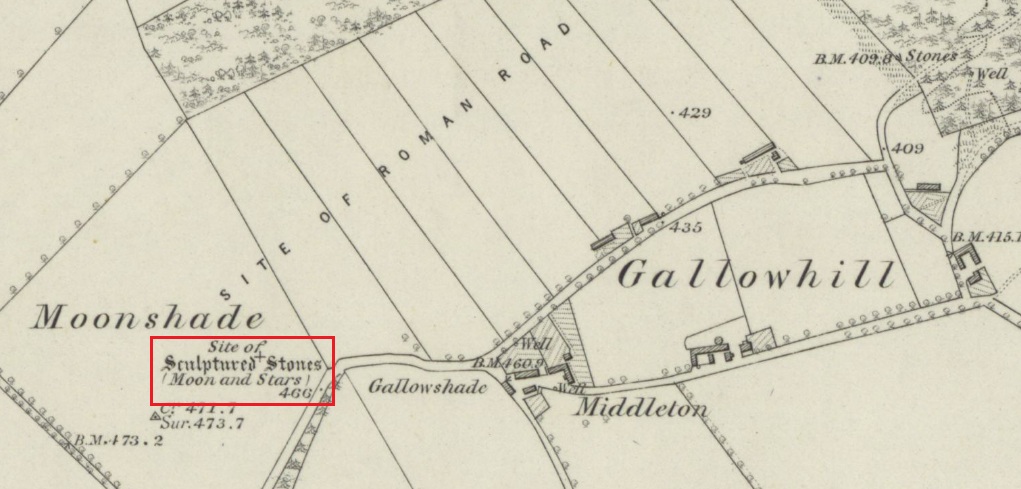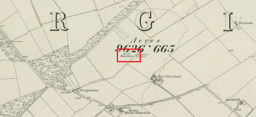 In an archaeological report by Alexander Hutcheson for the Scottish Society of Antiquaries in 1884, he described and illustrated an impressive cup-and-ring stone that was formerly built into the walls of a demolished house ¾-mile from its original position near Meikle Whitefield farm. Upon destruction of that house, the farmer of West Whitefield—a half-mile from its original position—then moved the stone it into his front garden. According to tradition, said Hutcheson, this stone