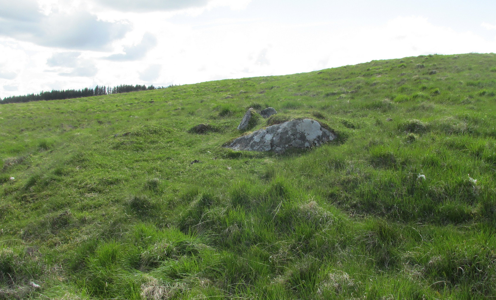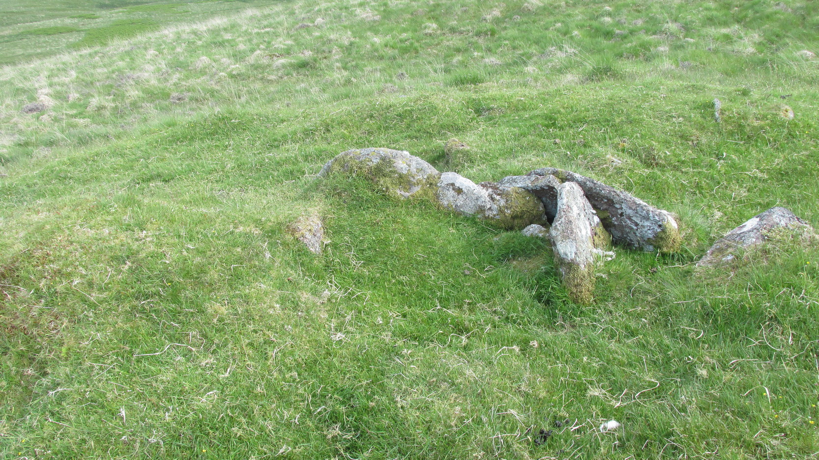 For a site marked as ‘Chambered Cairn’ on the OS-maps, you might be expecting a little bit more when you get here. Sadly, it’s not what it once was. Much of the covering stones from the cairn have been severely robbed and obviously used in the old and curiously-named ruin of Bothan na Plaighe below, and the large sheep-fold structures barely 50 yards to the north. All that’s really left to see here is the internal chamber, aligned roughly east-west, which seems to have originally been split into two sections. The remaining overgrown edges of the monument, barely two feet high at the most, measures roughly 8 yards by 9 yards, but is much denuded and can really only be noticed when you’re almost stood on top of it!