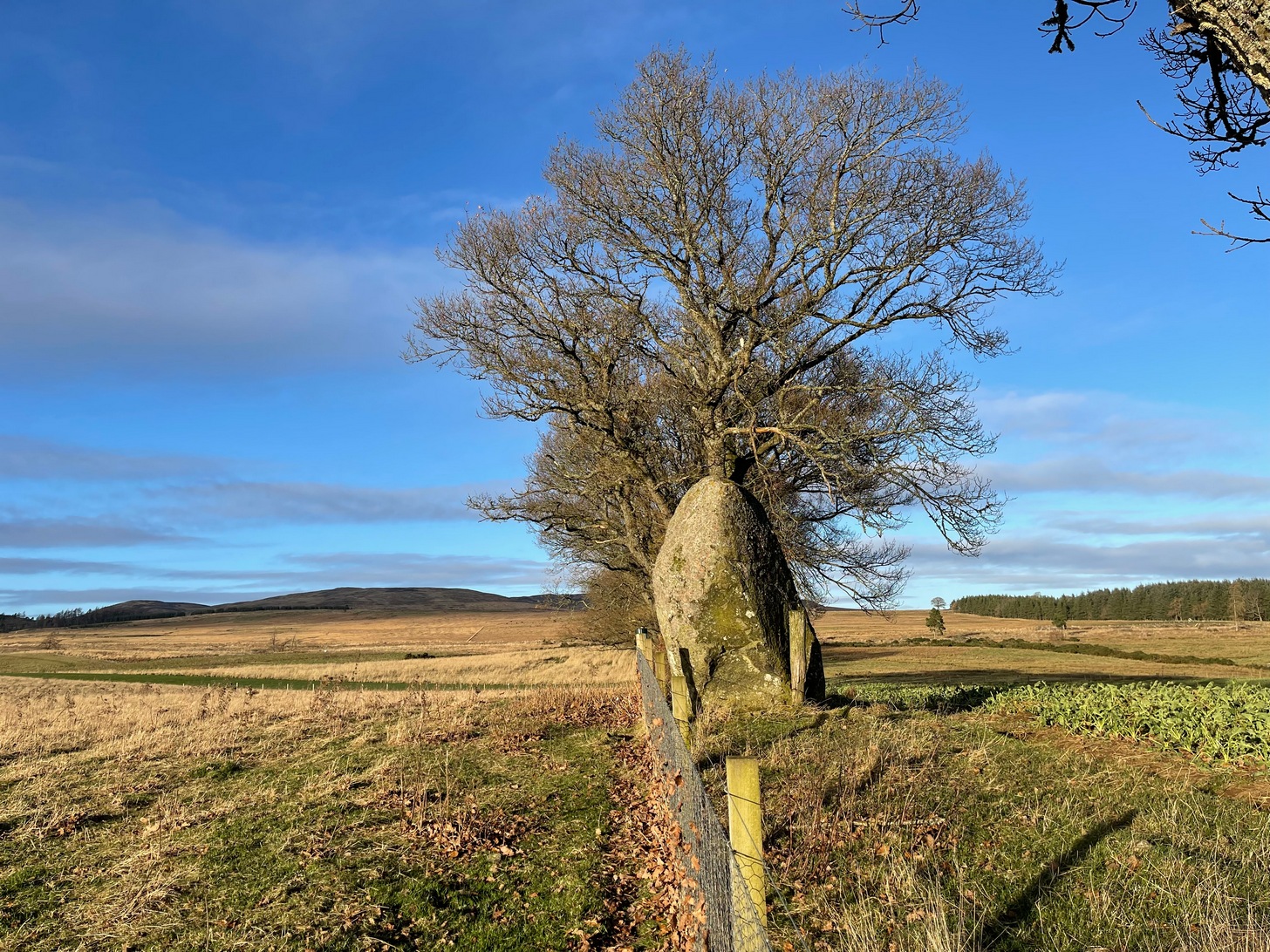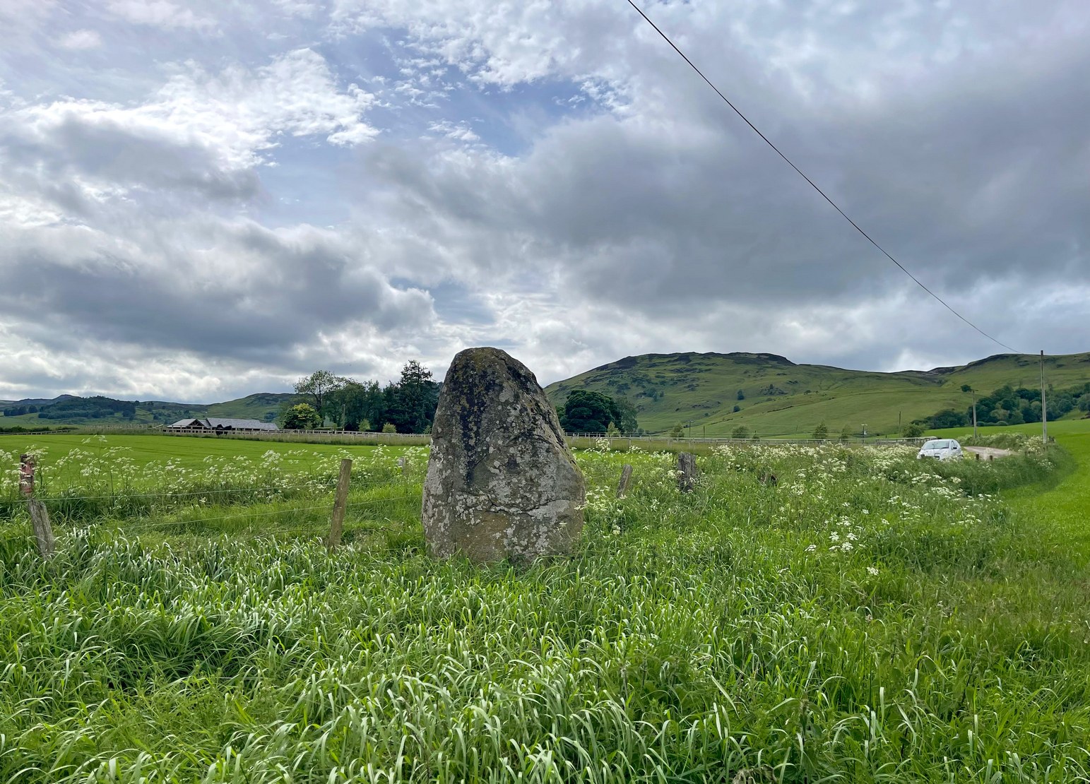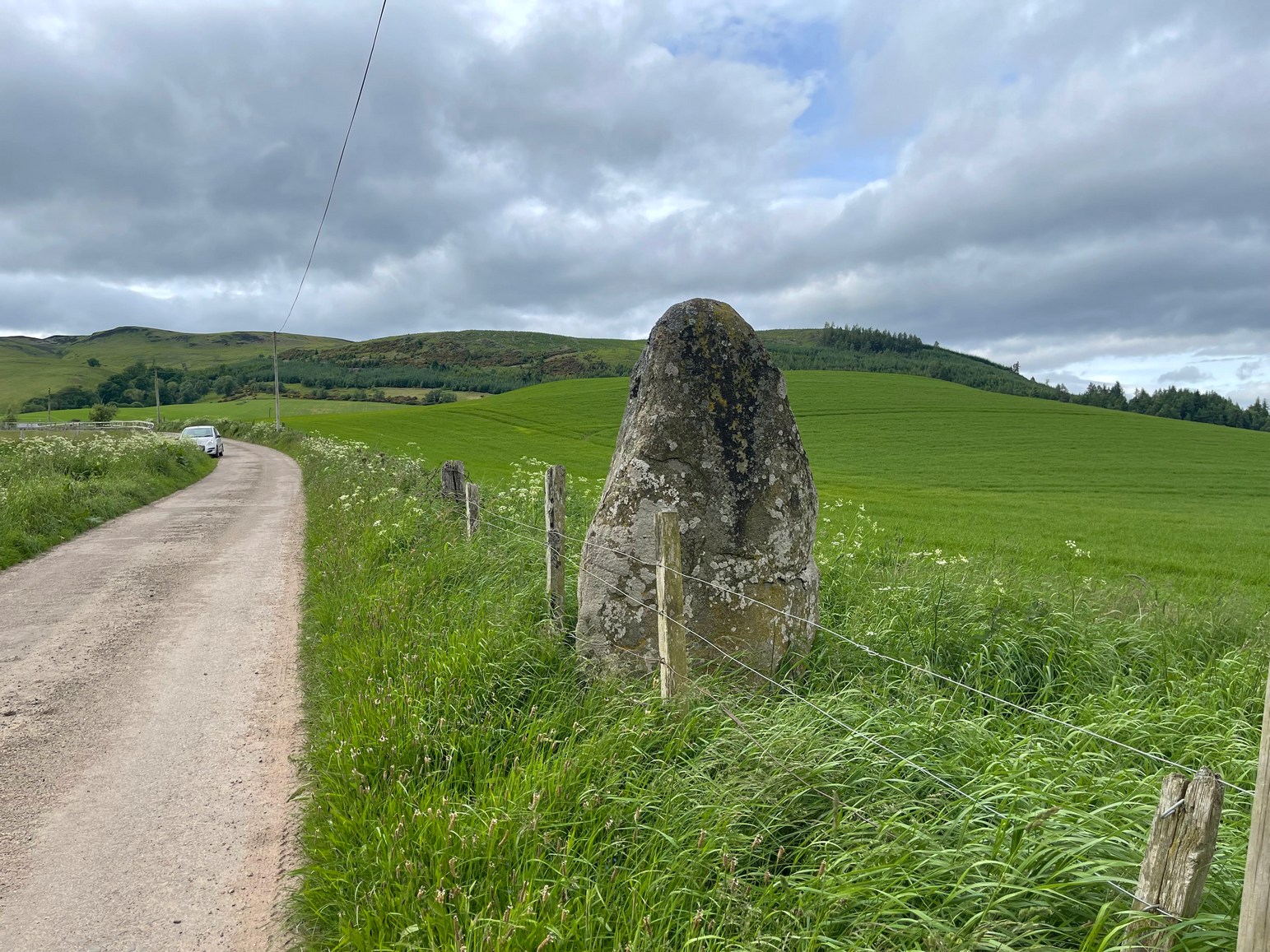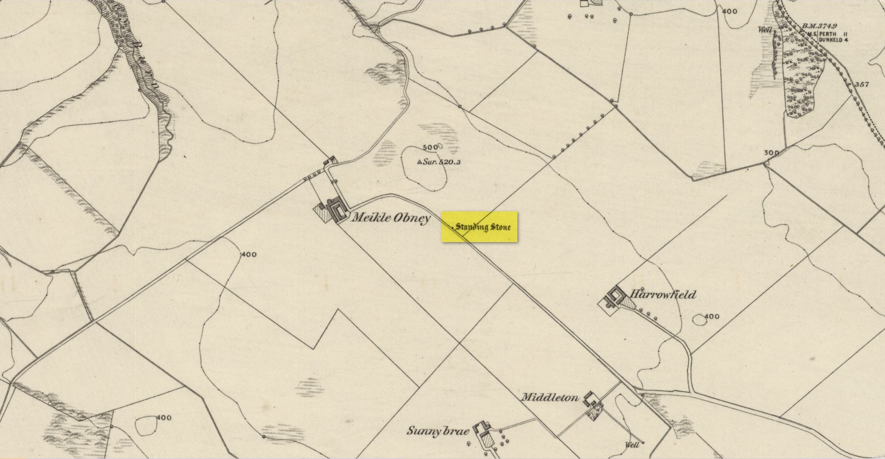 This is one of “the large rude upright stones found in the parish” that William Marshall (1880) mentioned briefly, amidst his quick sojourn into the Druidic history of Perthshire. It’s an impressive standing stone on the southern edges of the Obney Hills that doesn’t seem to be in its original position. And it’s another one that was lucky to survive, as solid metal staples were hammered into it more than a hundred years ago when it was incorporated into the fencing, much like the massive Kor Stone 6½ miles south-west of here.