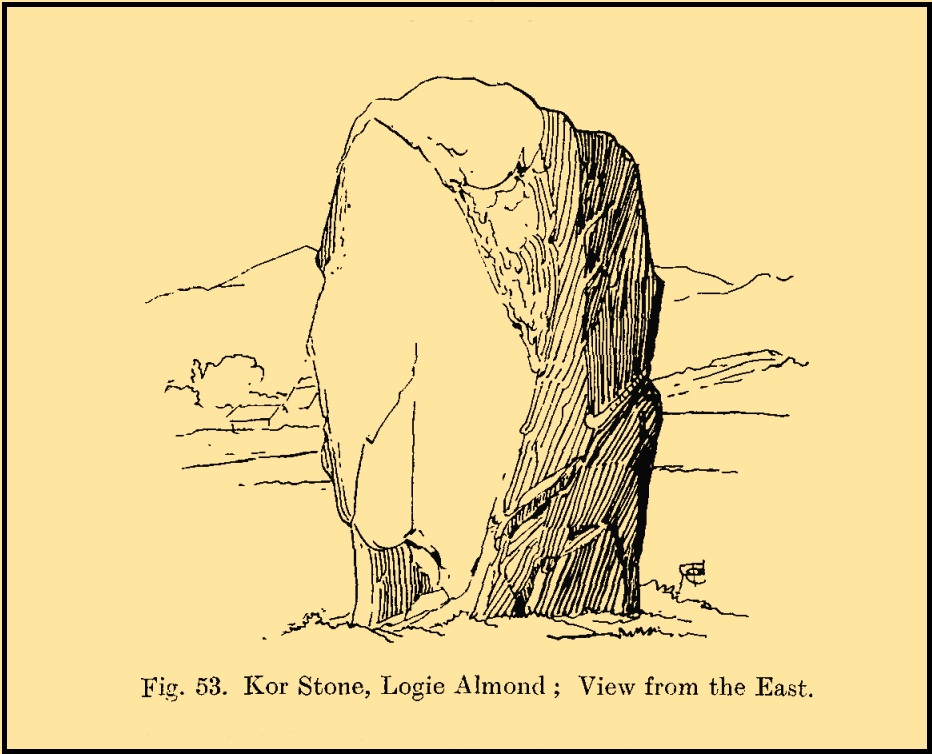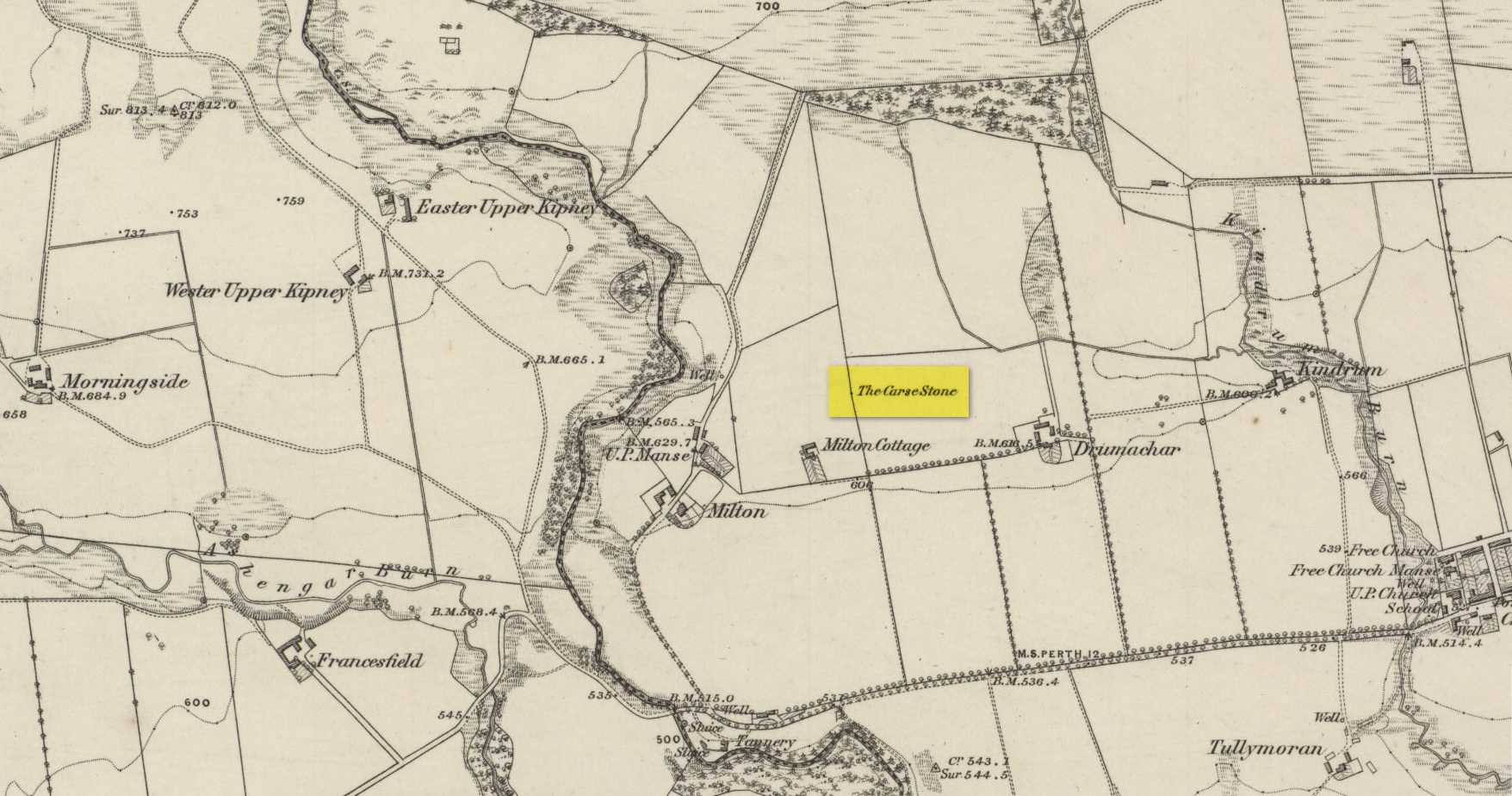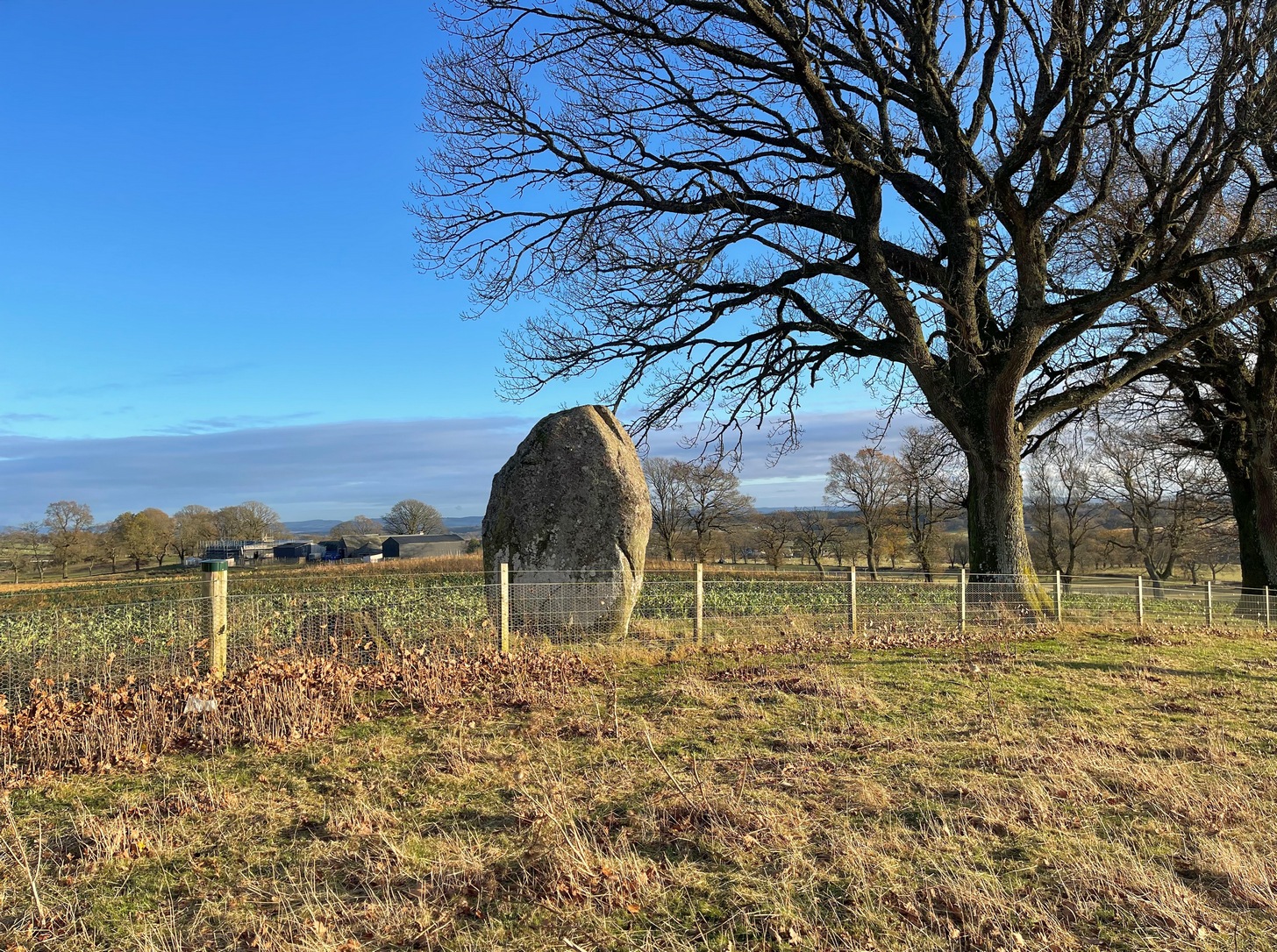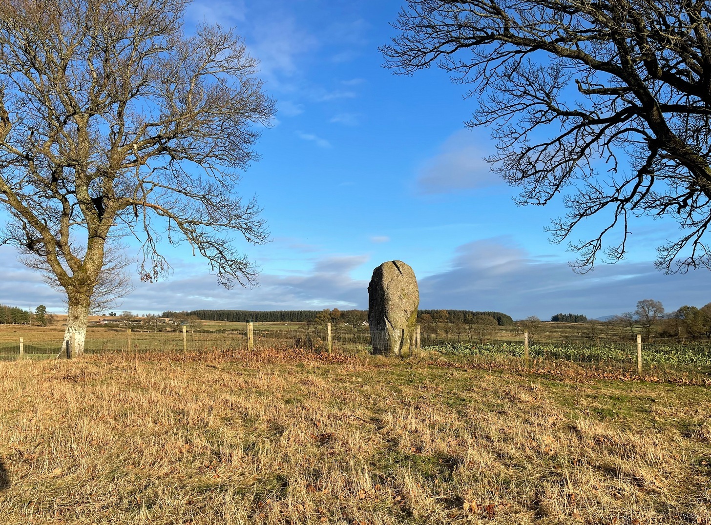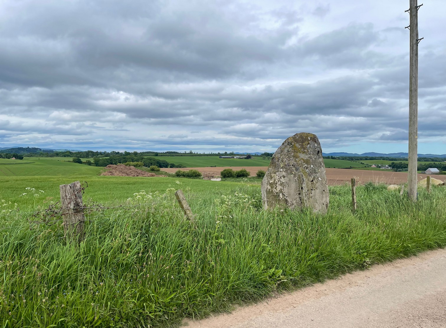 This is one of “the large rude upright stones found in the parish” that William Marshall (1880) mentioned briefly, amidst his quick sojourn into the Druidic history of Perthshire. It’s an impressive standing stone on the southern edges of the Obney Hills that doesn’t seem to be in its original position. And it’s another one that was lucky to survive, as solid metal staples were hammered into it more than a hundred years ago when it was incorporated into the fencing, much like the massive Kor Stone 6½ miles south-west of here.