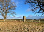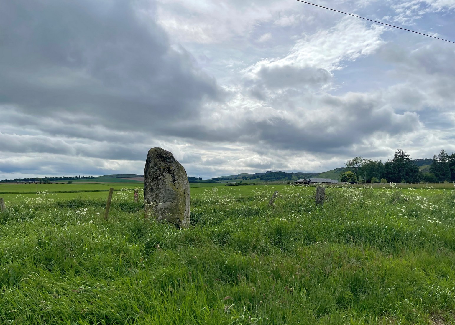 Travel along the B867 road from Bankfoot to Dunkeld (running roughly parallel with the A9) and you’ll reach the hamlet of Waterloo about one mile north of Bankfoot. As you approach the far end of the village, keep your eyes peeled for the small turning on your left and head up there for just over a mile. The road runs to a dead end at Meikle Obney farm, but shortly before reaching there you’ll pass this large standing stone on the right-side of the road, just along the fence-line. It’s almost impossible to miss!