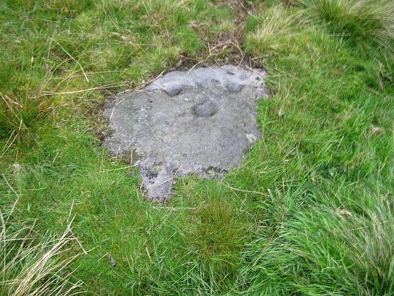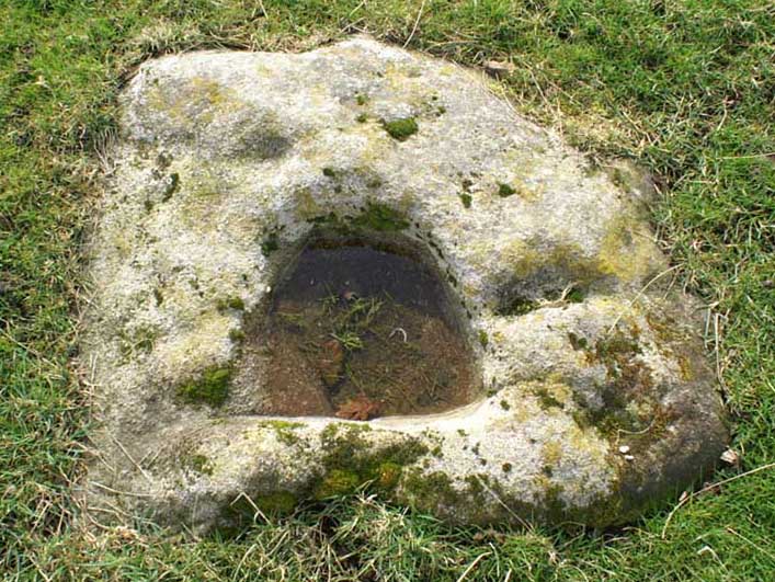 Our authors counted “eight possible small, badly worn cups, (with) three grooves running from central basin, all possibly natural.” The grooves may well be natural, but I’d say that one or two of the cups appear to be genuine. The large hollow in the middle of the stone may originally have been a cup-marking (or maybe even a cup-and-ring — but we’ll never know), before it became used as a site to erect a primitive cross.