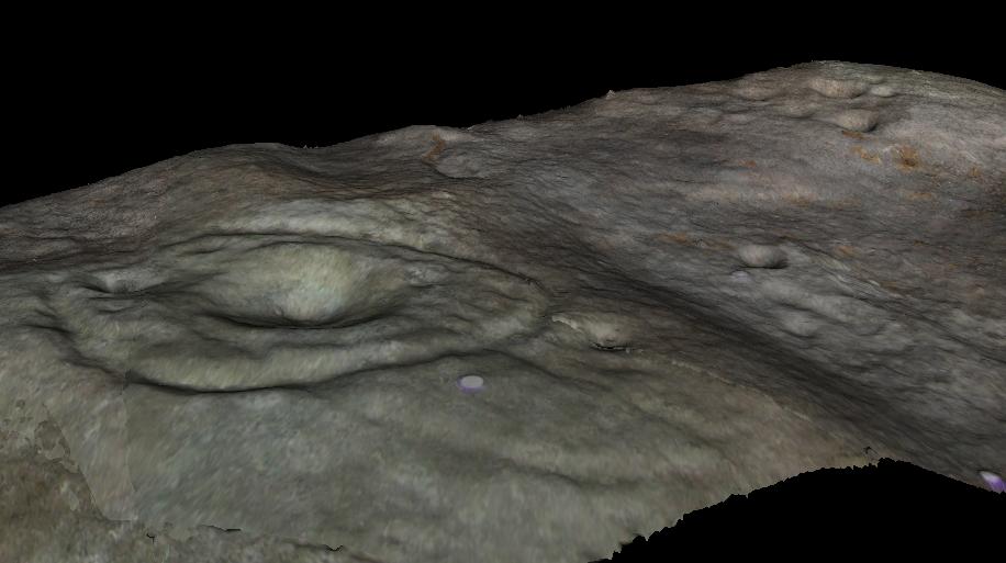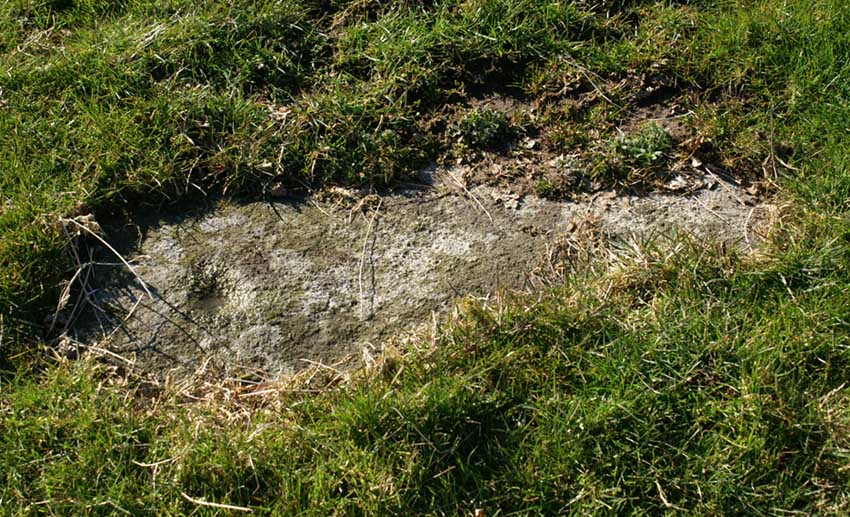 “A small area of rock (very possibly bedrock) measuring 40cm x 14cm at its greatest extent pokes up through the turf, showing one worn but clear cup-mark on its western edge (Fig 3). On its own, this marking would not be significant were it not for the fact that four other carved rocks are already recorded from this particular locality.”