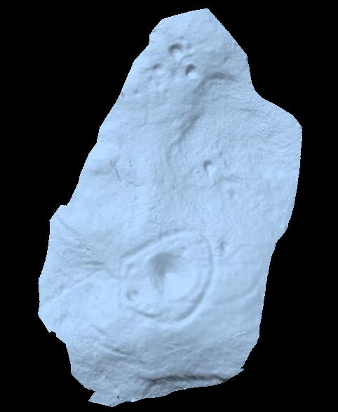 “Measuring 2.61m from N-S and 1.88m from W-E at its greatest extent, the carved surface carries quite a complex design… At its N end is a large cup/basin with an approximate diameter of 25-30cm, surrounded by a ring that may or may not be complete: 2 cups have been incorporated into the ring on its N and W side. W of this ring a groove leads off S to a further possible cup. On the E side of the large central cup are 3 further cups of varying size. These motifs are all enclosed within a wide groove, which forms almost a dome pattern. Out of the ring, a further groove runs NW out of the design, bisecting the enclosing groove, curving round to form a handle shape before running back in towards the large central cup. The groove shows signs of continuing E towards the edge of the stone. Just outside the W edge of the enclosing dome is one well-defined cup. S of this, in a slight depression, are 2 further cups of differing size. A straight groove appears to run SW out of the enclosing dome shape on its E side towards further motifs on the stone’s S side. The groove may run into an area of cup marks, but there appears to be a break before it continues. When exposed, the carvings looked quite fresh and sharp, suggesting that they had remained covered for some considerable time – possible since antiquity or at least from a time in the prehistoric past when cup-and-ring-markings had begun to lose their significance and were no longer required to be visible in the landscape.”
