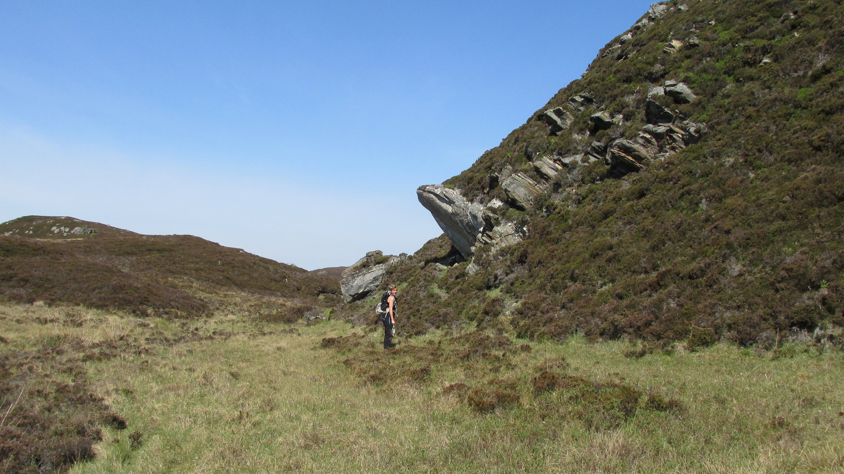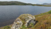 Roughly halfway between Bettyhill and Tongue on the A836 road, keep your eyes peeled for the sign to Skerray (4 miles) and travel down that road. About 1¾ mile on, take the tiny lane on your left up the slope for 0.6 miles (1km), and just before the sharp bend in the road (across a small bridge) there’s a gate on your left. Go thru here and follow the tiny path alongside the burn (stream) westwards for half-a-mile until where the waters become a bog within a wide oval bowl in the landscape. At the far-side you’ll see two large boulders sat above this watery bowl. That’s where you need to be!