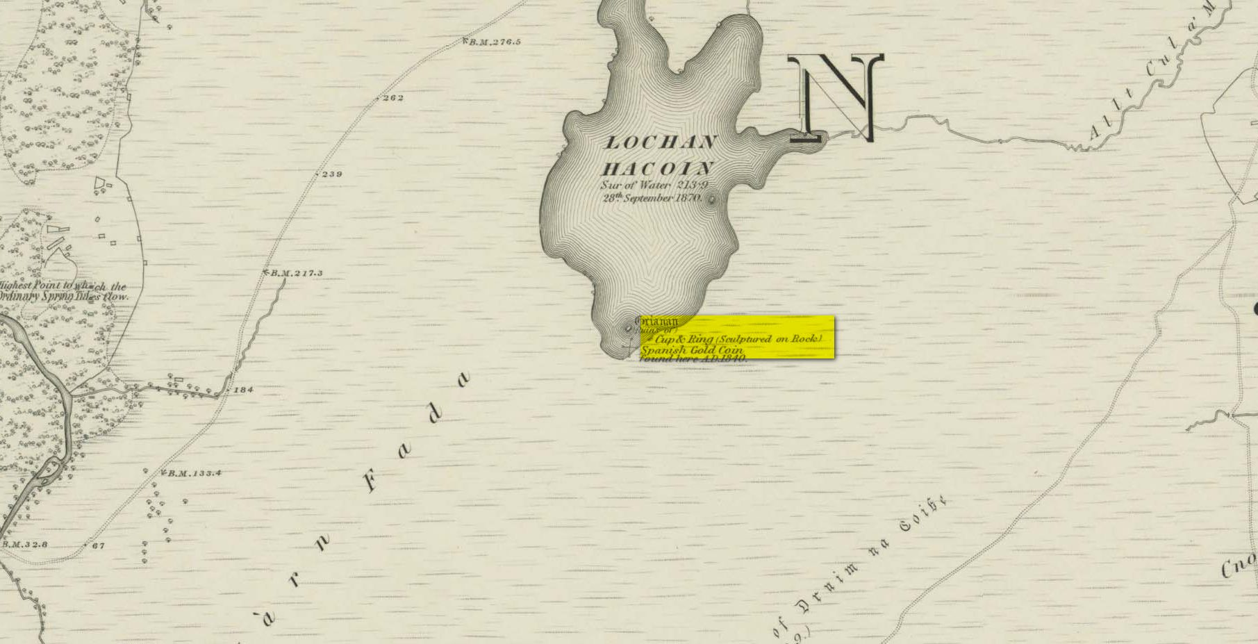 The holy well is referred to in Historic Scotland’s Canmore entry, citing both the New Statistical Account and Name Books as referrals to the site, yet neither of them include this well in their surveys; it is only through Horbugh that we hear of this site—and we know not where it lived! In the event that it still exists, we’d expect it to be not more than 2-300 yards from the edge of Loch ma Naire; or perhaps it may be the source of the Loch ma Naire burn itself, nearly a mile to the east…. Seek and thee shalt find, as the old saying goes…