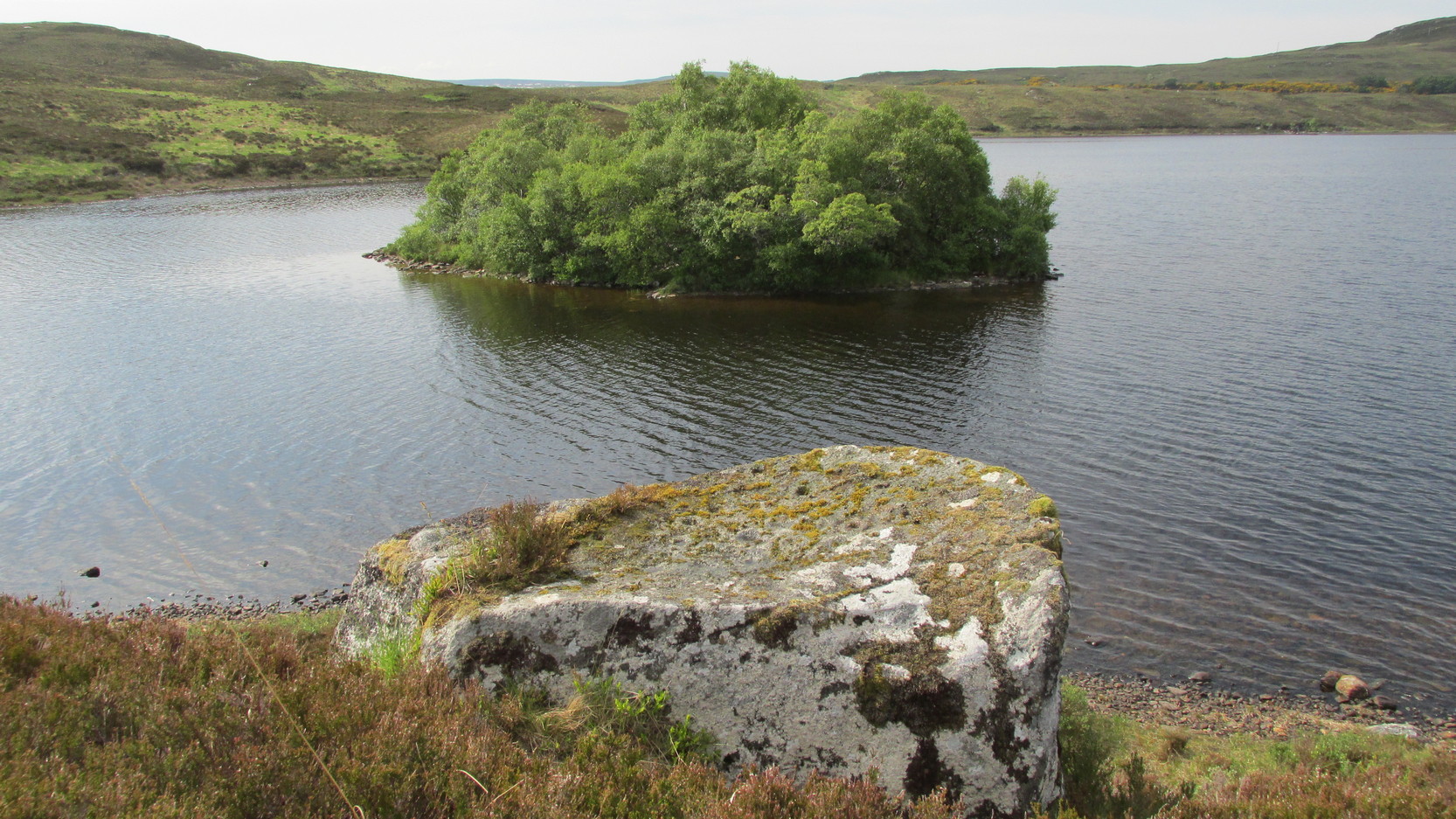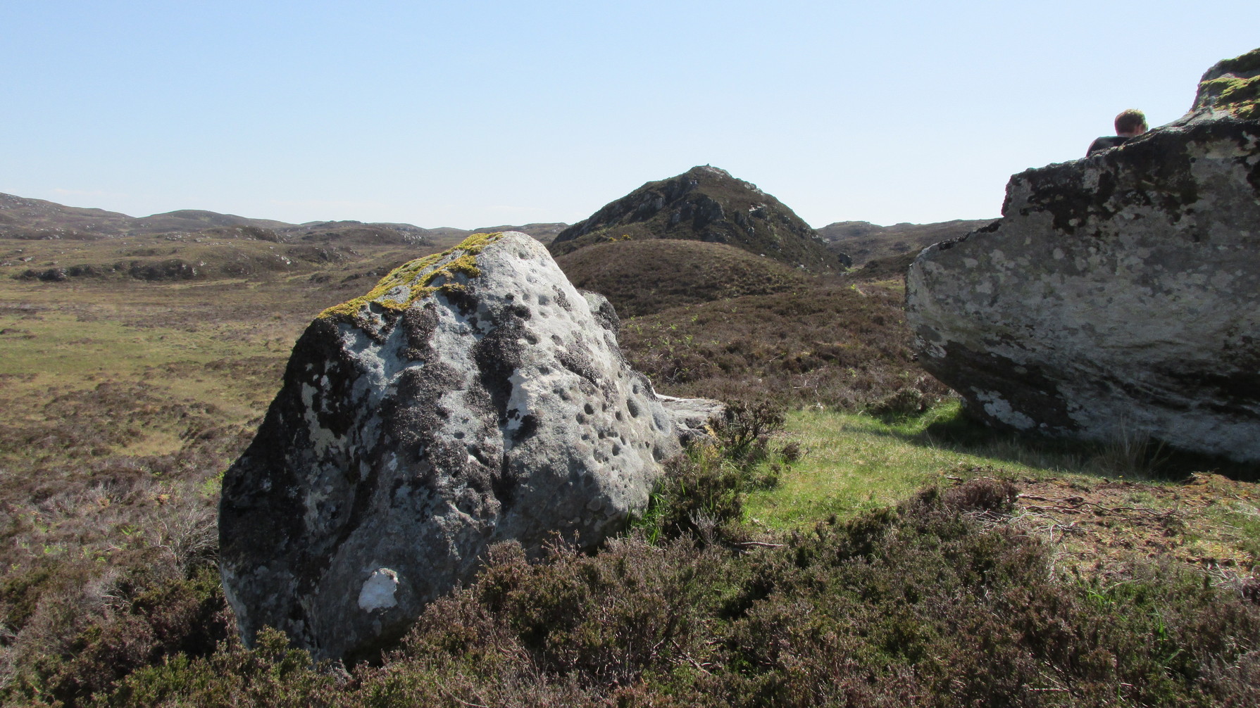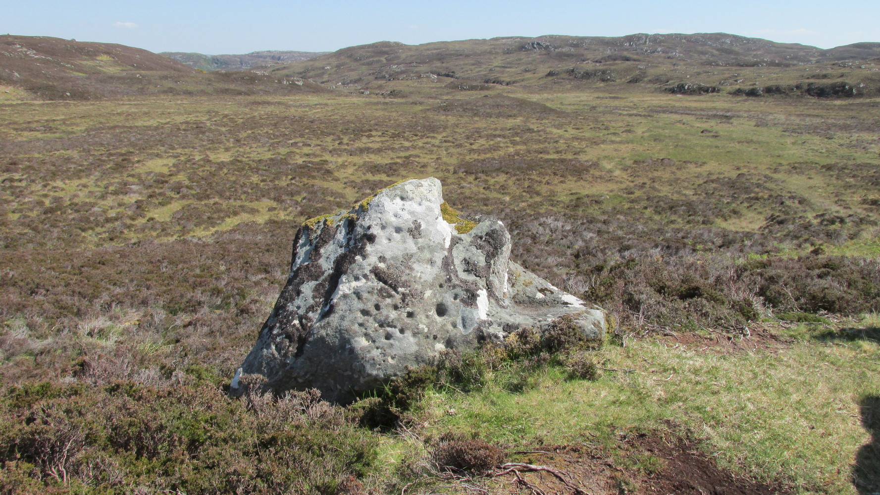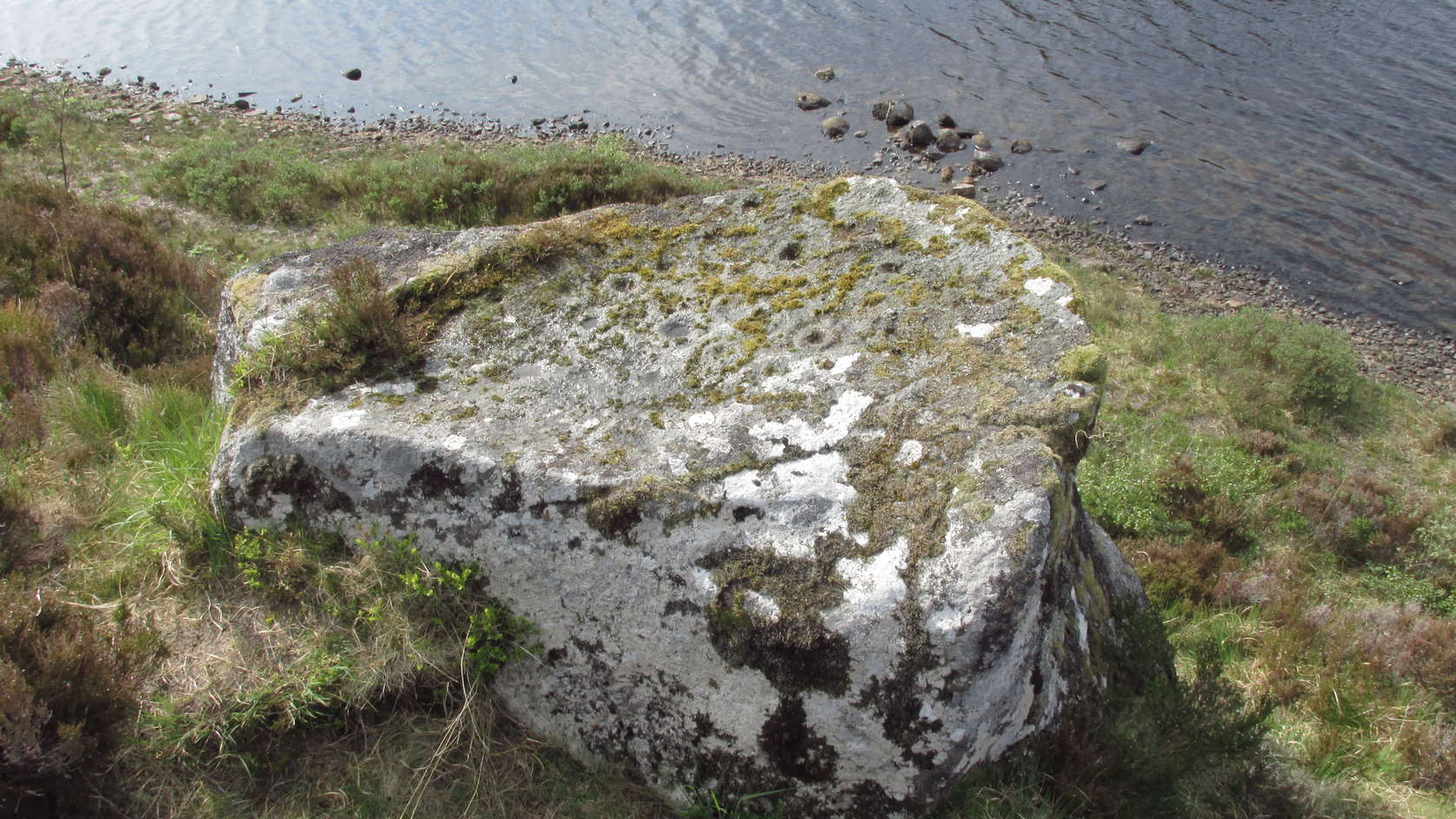 “On the edge of the precipitous bank of the loch, and exactly opposite the island, there is a large boulder with a flat top, and on this there are a number of cups and rings… This stone is not generally known. Old Ross, the gamekeeper at Tongue, first told me of it, and he and I scraped off the moss and exposed the whole. He thought it was for playing some game. On the left of the stone, on a bit separated by a crack, there is a sort of a figure which appears to have been formed by cutting away the stone around it and leaving it in relief, and also some artificial cutting on the right, a sort of circular groove.”