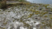 The main cluster of these cups can be found on its near-vertical western-face: an unusual feature in itself! There are several cups on its southern curve and, further round, low down on the east side of the rock we see a few more of them hiding away. These, too, seem to have been Nature’s handiwork, then enhanced by the hands of wo/men. The carving was described in Hew Morrison’s (1883) work as possessing two groups of cup-marks,