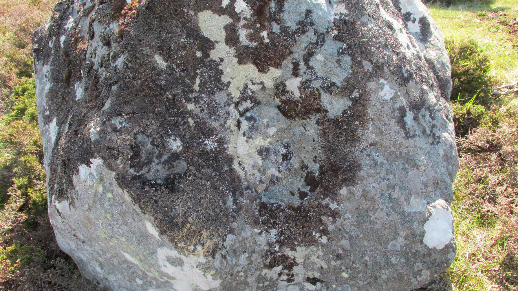 This large, earthfast, ovoid ball of rock has a series of cup-marks on three of its curvaceous faces, some of which seem to be natural, with a number of them “enhanced” by human hands at some time in the long long ago….