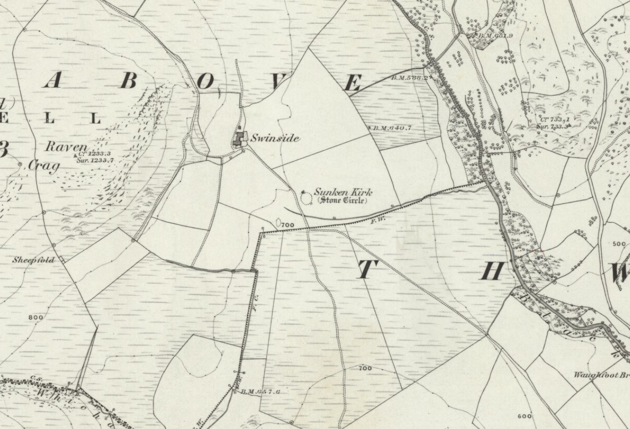 “In the neighbourhood of Millum, at a place called Swinside, in the estate of William Lewthwaite Esq., of Whitehaven, is a small but beautiful druidical monument; it is circular, about twenty eight yards in diameter; the stones of which it is composed are from six to eight feet high, all standing and complete. A little to the south, is another of larger dimensions, but not in so perfect a state: the neighbouring people call those places by the emphatical names of Sunken Kirks.”