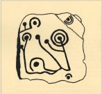 “A cup-and-five-rings, the rings slightly flattened where a radial groove from the cup passes through them. 23cm (9½in) diameter, grooves connecting this with 3 other cups. Carving depths up to ½cm (¼in). The rings are rather lightly pecked though quite wide and well preserved. All gapped, except the inner ring.”