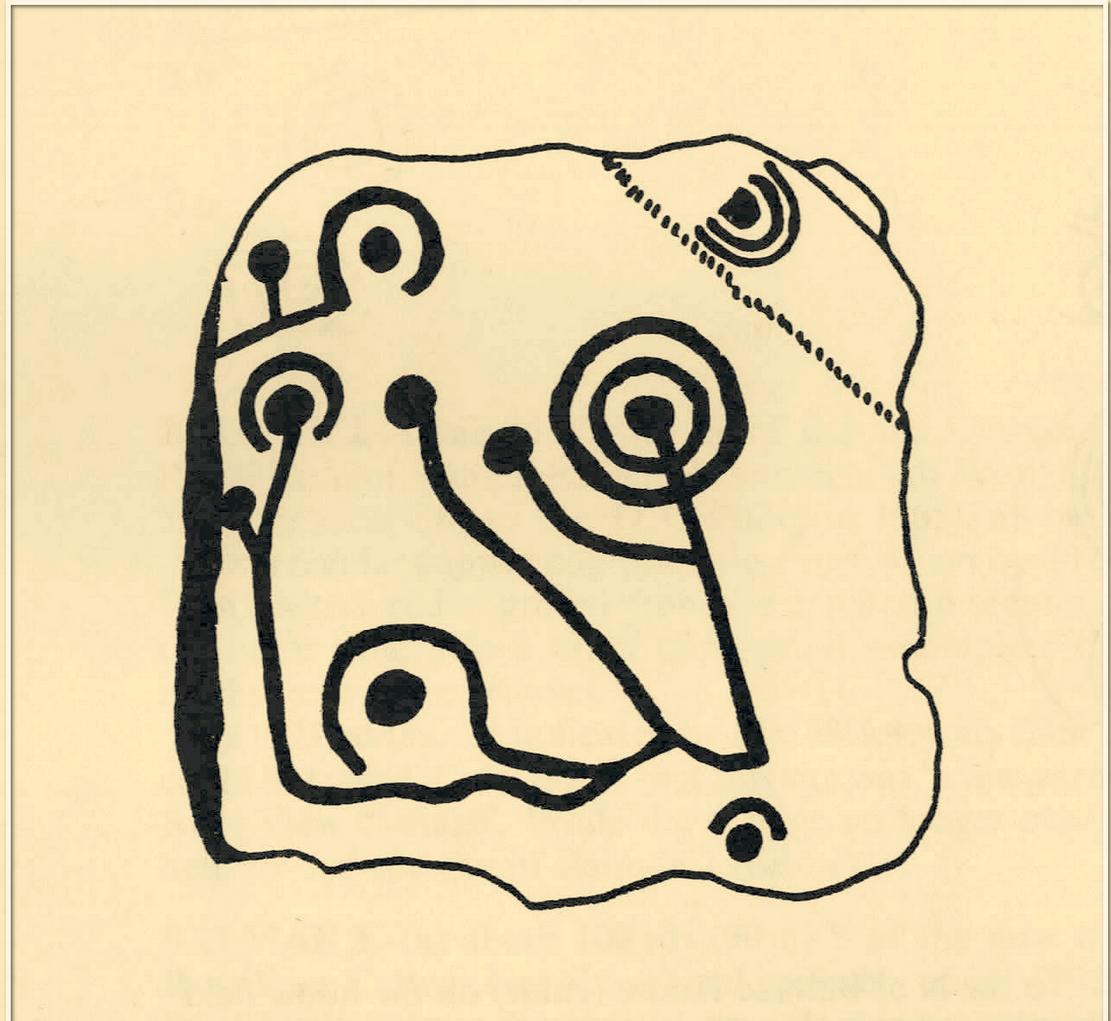 A small multiple-ringed archetypal design consisting of a central cup-mark with seven consecutive rings emerging from it, with a second outlying, incomplete cup-and-double-ring that nearly touches the outer edge of the seven-rings, was found by a Mr Sproat “in the bed of a shallow stream on Laggan farm” in 1960. The design, as the old photo (right) shows, is very well preserved, suggesting that it cannot have been in the stream for too long, as the erosion on the carving isn’t in anyway excessive. In all likelihood it originally came from a nearby prehistoric tomb: of which, there are several upstream from the farm.