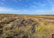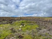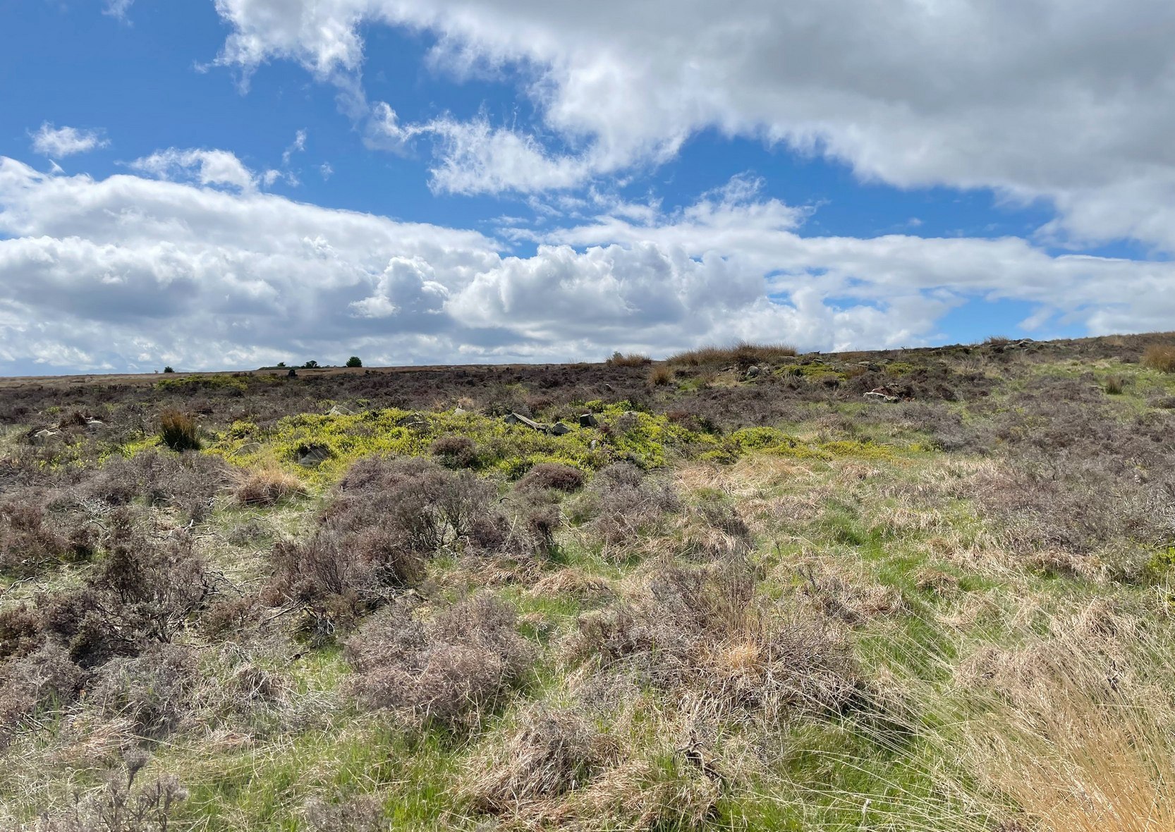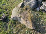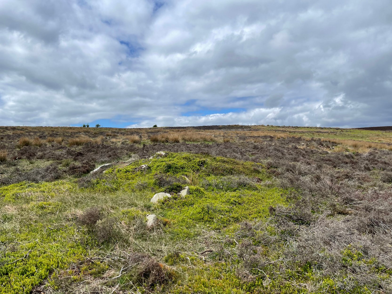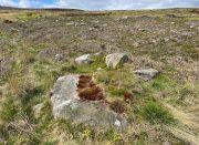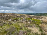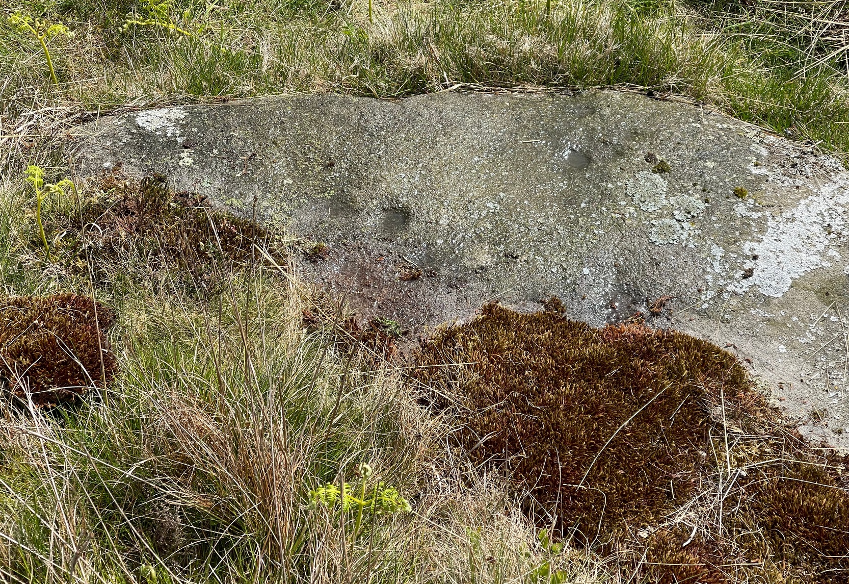 This very basic cup-marked stone was, until recently, covered in dense gorse, making access to the site almost impossible. But following a fire that happened here not too long ago, the smoldering remains needed to be cleared and, once the job was done, we were able to see the two distinct ‘cups’ that were first described in Maarten van Hoek’s (1996) survey. But the cups that he described are, most likely, little more than Nature’s handiwork. I’m somewhat skeptical of them as being the real deal. In the same survey, he added another site, which are just natural bowls in the rock just over 100 yards southwest of here as being cup-marks — which they’re not!