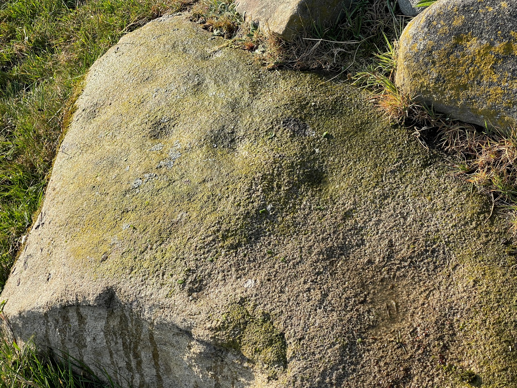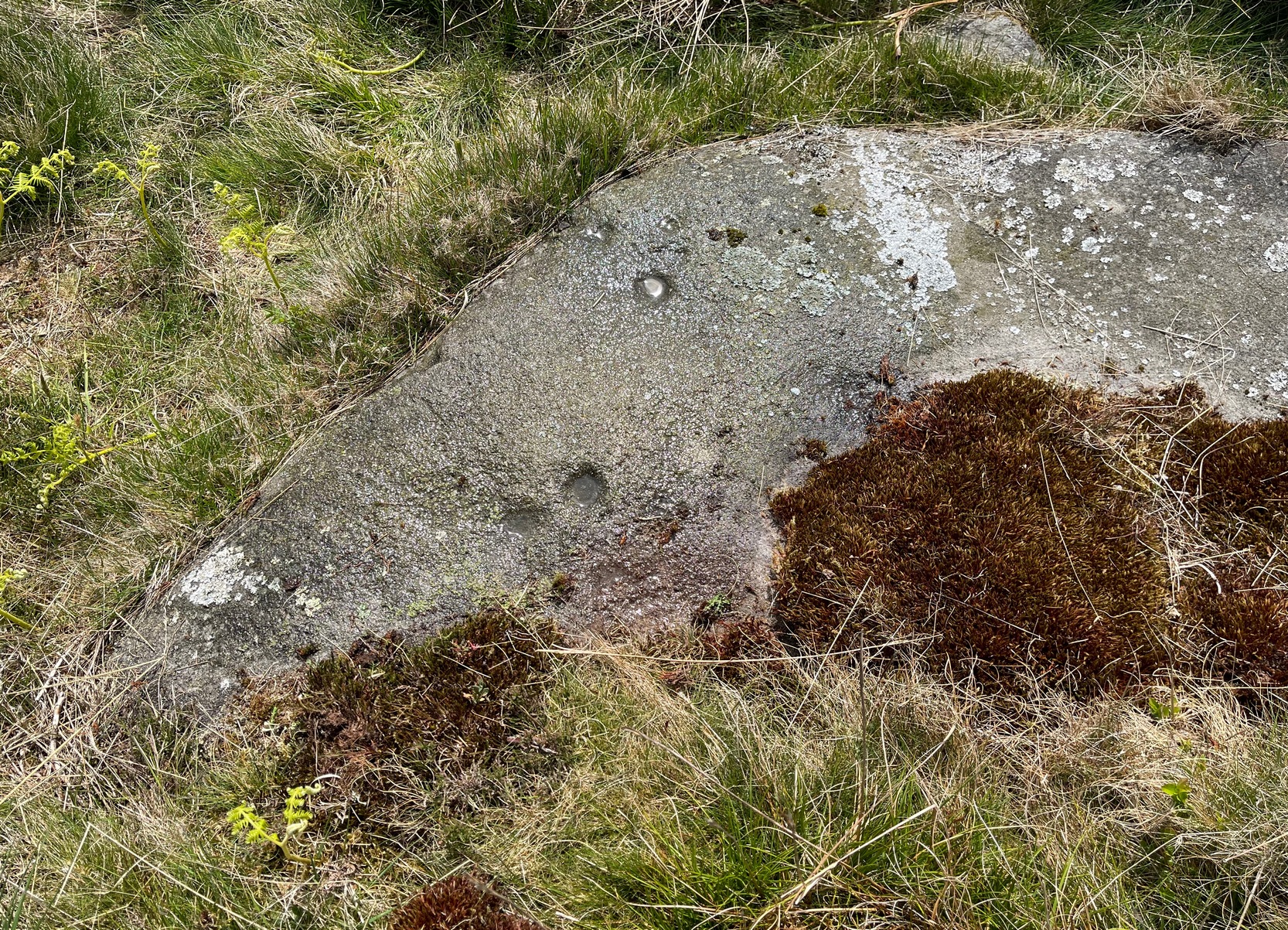 When you consider there are multiple-ringed carvings close by on the same geological ridge as this carving, there’s little wonder this fella hardly gets any attention: the design here is nothing special compared to its close neighbours. That aside: on this small flat surface we have six or seven simple cup-marks; most of them quite small, with the largest of the lot having what looks like a small carved arc around one side of it—although I couldn’t make my mind up one way or the other to be honest. A few more visits might prove more conclusive.