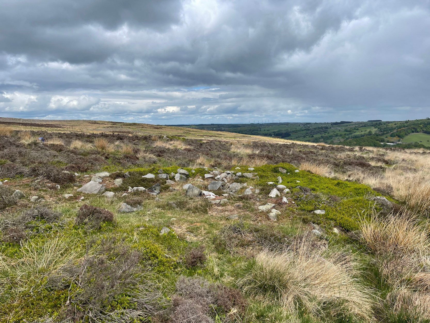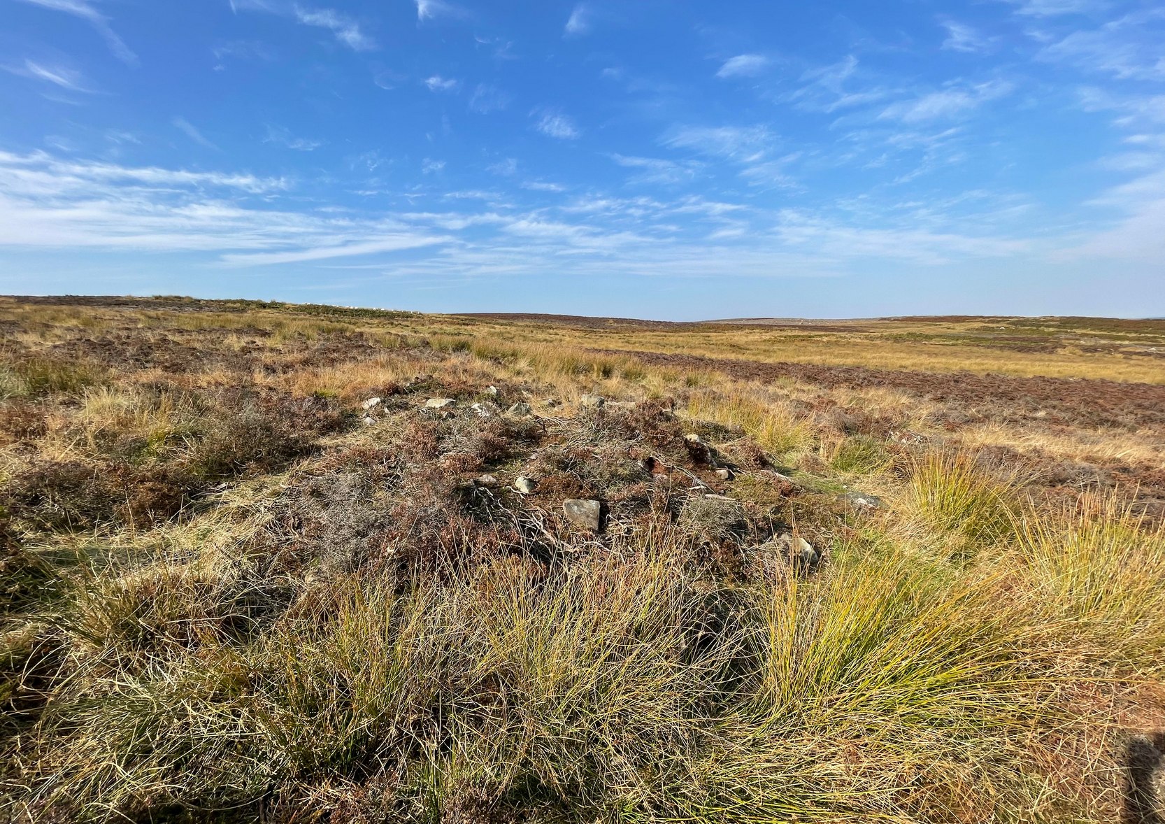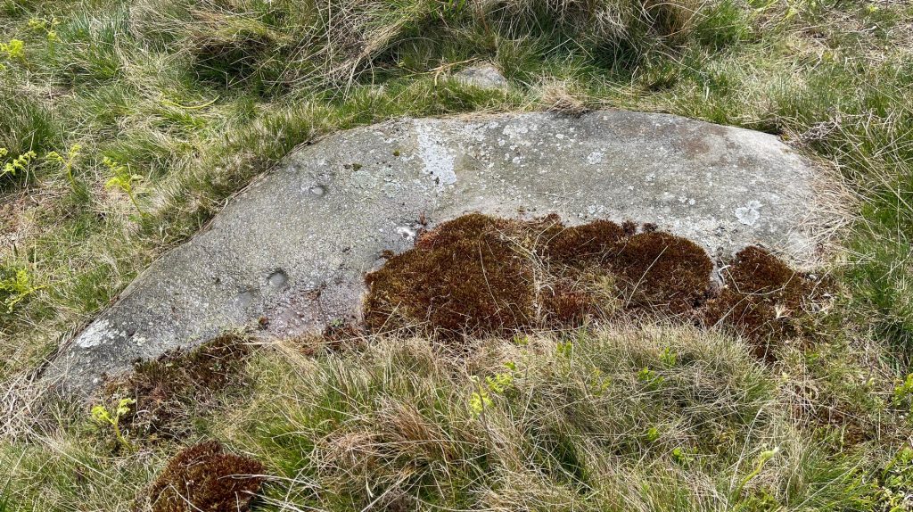 You’ll check this out when you’re doing your tour of this petroglyph cluster and sit here to admire the view. It’s the last of the small bunch of carvings, on level ground, close to the denuded cairns. It consists of just eight cup-marks, all of which are carved close to the edge of the stone on its upper sloping surface; although this doesn’t tally with Margaret Stewart’s (1967) description of any of the carvings hereby. There’s nowt much more to be said about it to be honest; apart from saying how it’s highly likely that other carvings remain hidden, undiscovered, not far from this stone along the edge of these hills.