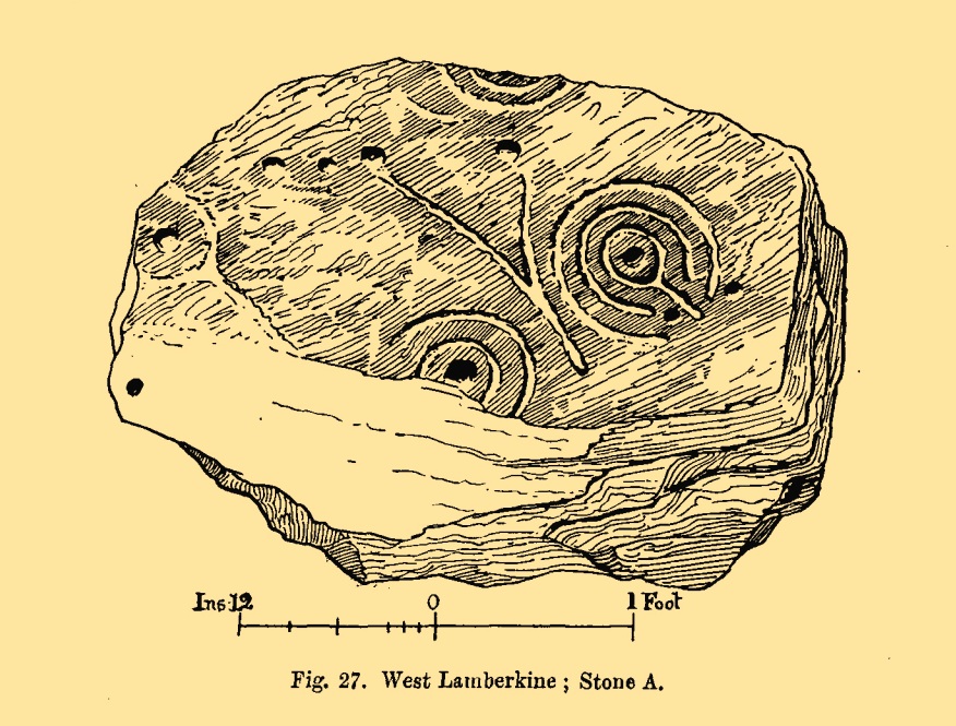 The records at Canmore have suggested that this lost carving and the missing petroglyph of West Lamberkine (1) nearby are one and the same. This is unlikely. West Lamberkine (1) was described simply as a cup-marked stone, whereas this stone possessed clear identifiable cups and rings. It would be difficult to make such an elementary mistake.