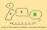 “at a point 333 yards east of the farm-steadings, where two hedges meet at right angles. Four stones…lie close together. They appear to be all of bastard whinstone. The middle stone, B, has its longer axis ESE and WNW. It is only 3in inches thick. The stones D and C are each 6 inches thick. No marks are to be seen on any of these. But on A is the very distinct sculpturing shown in the illustration…unfortunately not complete, owing to the flaking off of large strips of the weathered lower portion of the slab. There is a strong suggestion of a cist-cover in the shape and size of this stone, which the close proximity of the two other squarer and thinner stones helps to enforce. Though these stones have been known to the tenant for over thirty years, this is, I believe, the first record made of their position and features.”