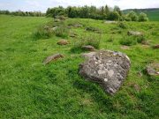 “The cup-and ring-marked stone here was first brought to my notice by Mr David Smith in the summer of 1900. He then reported that the stone appeared to be one of a large number forming a rough circle in a plantation on the west of this farm. On reaching the house, I was fortunate in meeting Mr Douglas the tenant, who at once conducted me to the westmost field and showed me the stone. It is a squarish and not very thick block of ‘bastard whinstone,’ uneven, weathered, and moss-grown. It measures 2 feet 10 inches by 2 feet 8 inches. As far as examination in the gloom of the clump of trees allowed, I believe I am correct in recording…the seven single cups and the two surrounded by rings as all the definitely artificial marks now visible on this stone. The stone at present lies prone upon the curved alignment of many stones which have been set on edge, enclosing an area roughly oval, and measuring in round numbers about 210 feet nearly east and west by 90 or 100 feet north and south.”