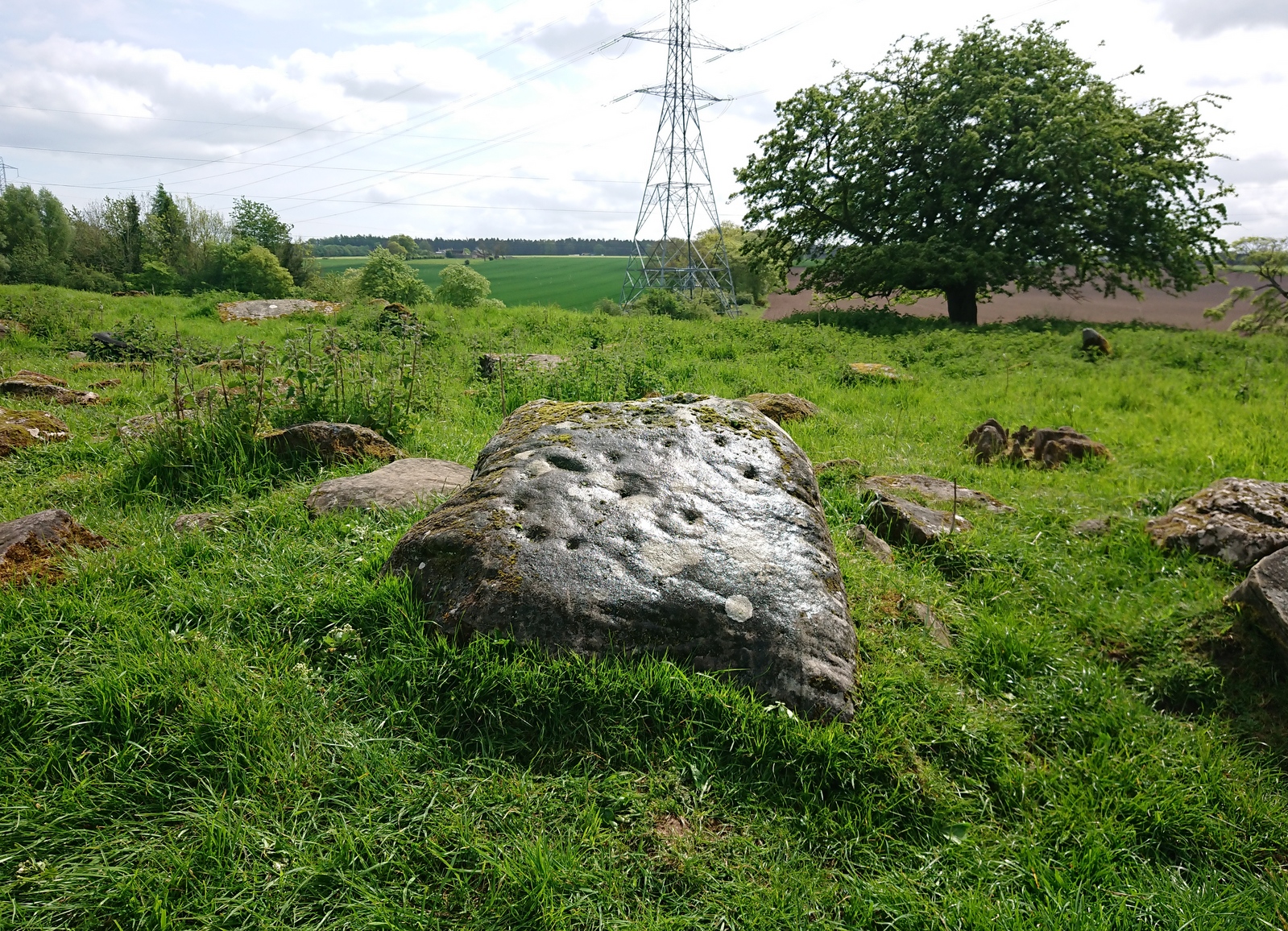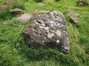 There’s another oddity about it too, as one (or more) of the cup-markings have been incised and worked upon in much more recent centuries, as evidenced by a small thin almost pencil-like cut into the centre of one of them, perhaps with the intention of smashing the stone to pieces. A geologist or stonemason could perhaps look at this and let us know what they think. Thankfully the stone and the carved design remains intact!