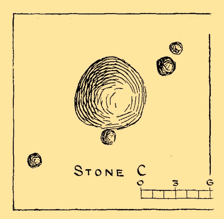 “…lies 10 feet 3 inches to the north of stone A, and measures 4 feet by 2 feet 3 inches. It has a single cup cut on it.”