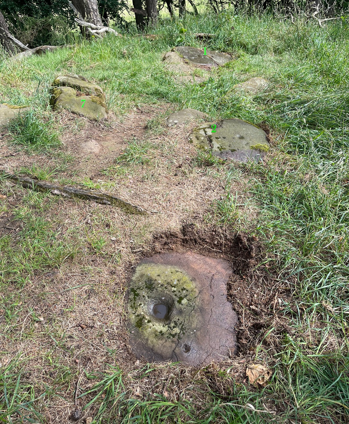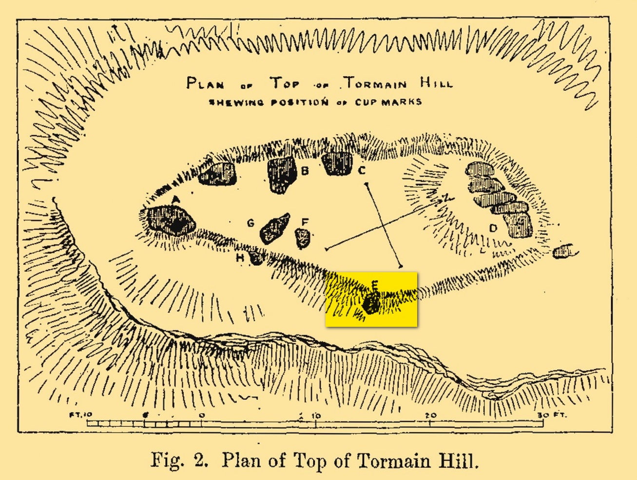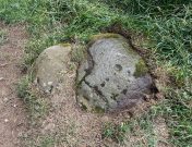 “is situated about half-way between stones A and D, and is furthest to the east. It measures 1 foot 4 inches by 1 foot 9 inches, and projects 1 foot above the turf. Its upper surface is flat, and on it are carved eight cups varying in diameter from 1 to 2½ inches. There are two connecting grooves between three of the cups, forming a rude cross. Another cup has a channel leading over the edge of the stone.”