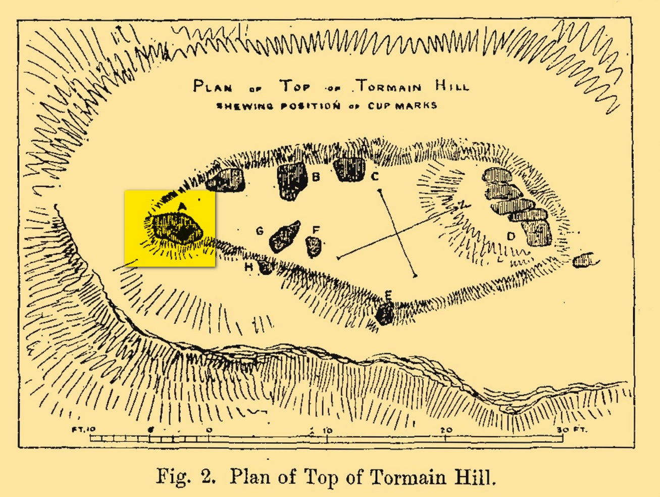 “there is a group of three cup-like hollows near the highest summit of the hill; this last has, however, been altered in our own day by the officials of the Government Ordnance Survey combining them into one figure, by drawing from cup to cup their well-known and characteristic mark of the Queen’s ‘broad arrow.’”